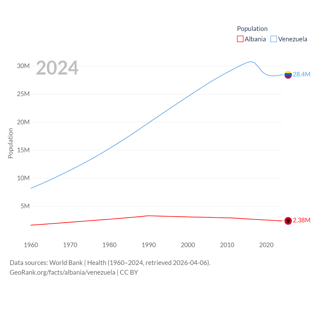 Albania has a population of 2.38M (ranked 144/197), compared with 28.4M in Venezuela (ranked 53/197). Albania's land area is 10,579 sq mi versus 340,561 sq mi for Venezuela (ranked 143rd vs. 32nd).