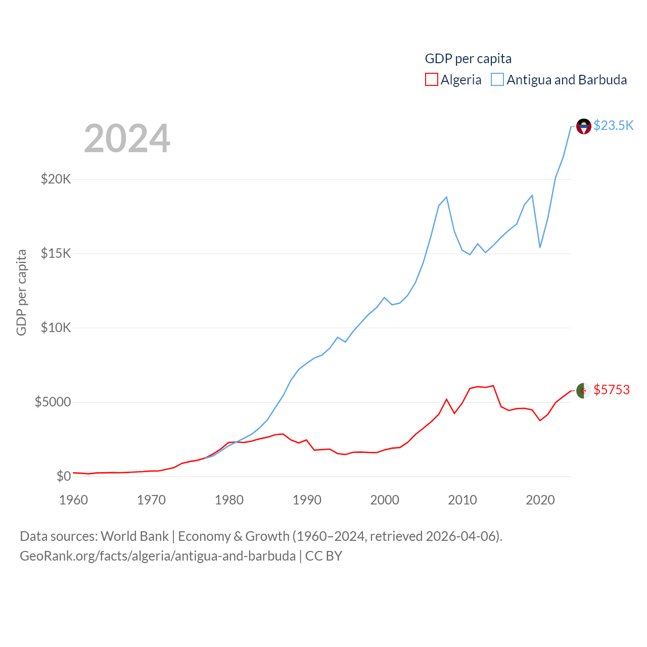 By GDP, Algeria ranks 51/197 ($269B) and Antigua and Barbuda ranks 177/197 ($2.21B). By GDP per capita, Algeria ranks 114/197 ($5,753), while Antigua and Barbuda ranks 53/197 ($23,542).