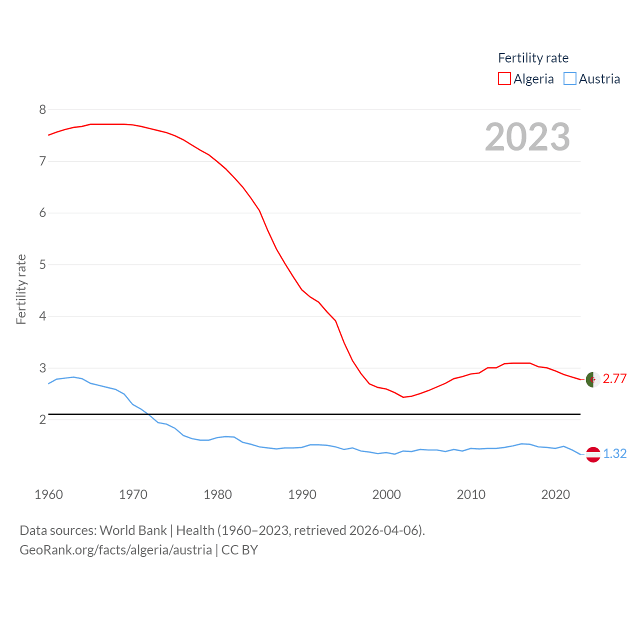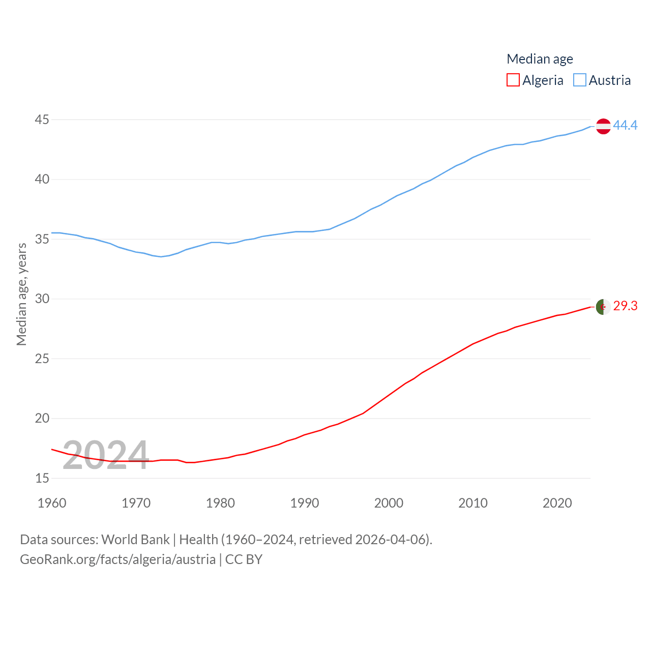 Algeria has a population of 46.8M (ranked 33/197), compared with 9.18M in Austria (ranked 99/197). Algeria's land area is 919,595 sq mi versus 31,861 sq mi for Austria (ranked 10th vs. 113th).