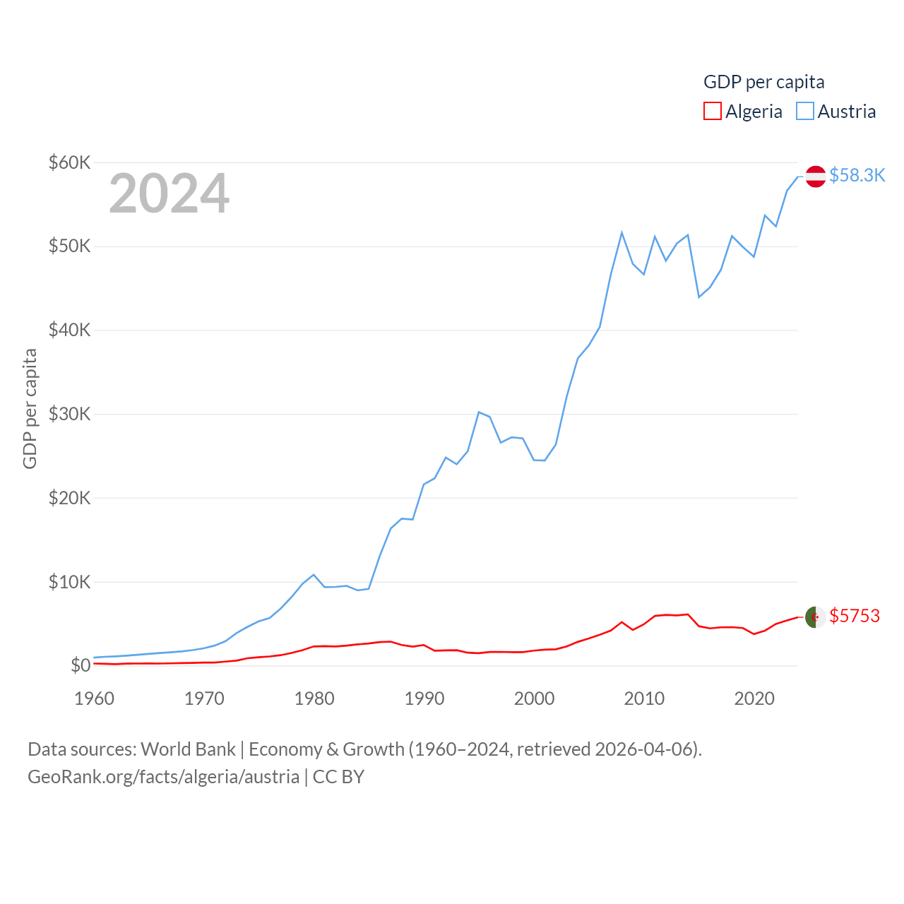 By GDP, Algeria ranks 51/197 ($269B) and Austria ranks 30/197 ($535B). By GDP per capita, Algeria ranks 114/197 ($5,753), while Austria ranks 16/197 ($58,269).