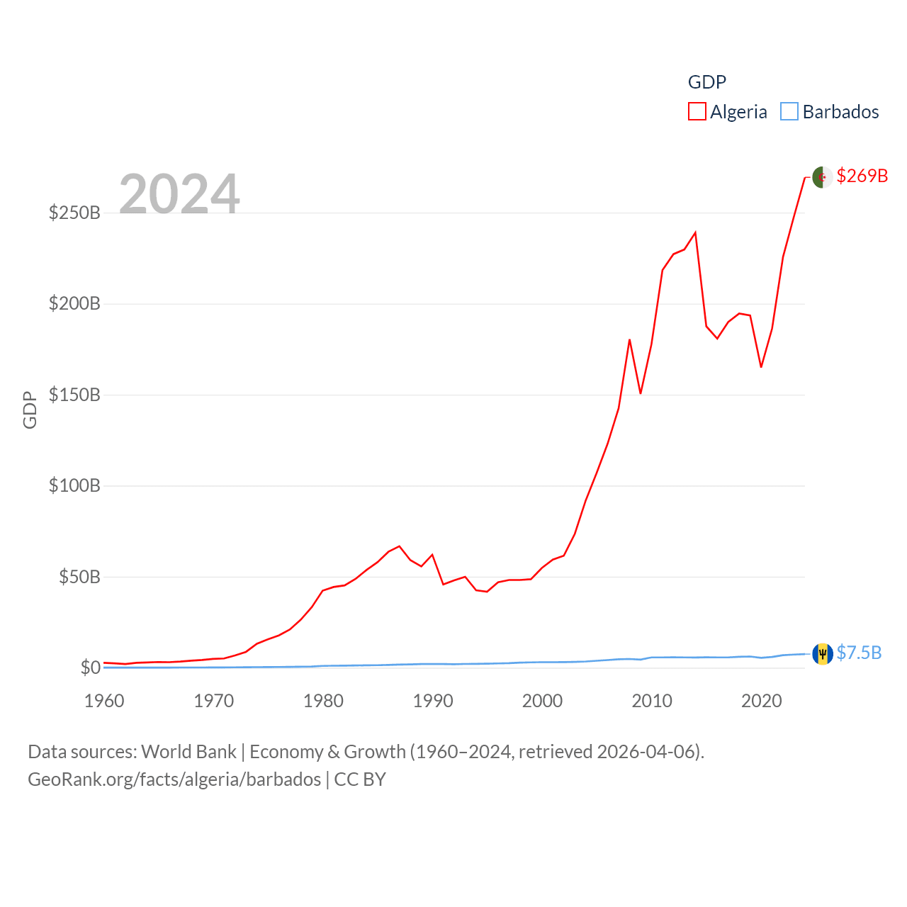 By GDP, Algeria ranks 51/197 ($269B) and Barbados ranks 157/197 ($7.5B). By GDP per capita, Algeria ranks 114/197 ($5,753), while Barbados ranks 46/197 ($26,545).