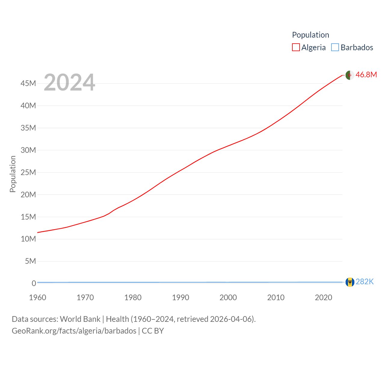 Algeria has a population of 46.8M (ranked 33/197), compared with 282K in Barbados (ranked 175/197). Algeria's land area is 919,595 sq mi versus 166 sq mi for Barbados (ranked 10th vs. 184th).