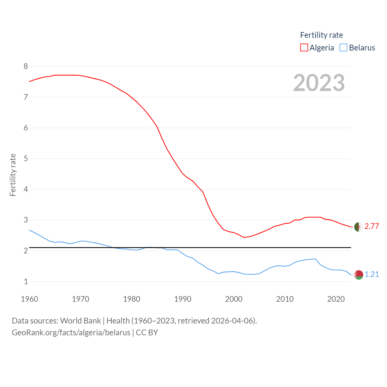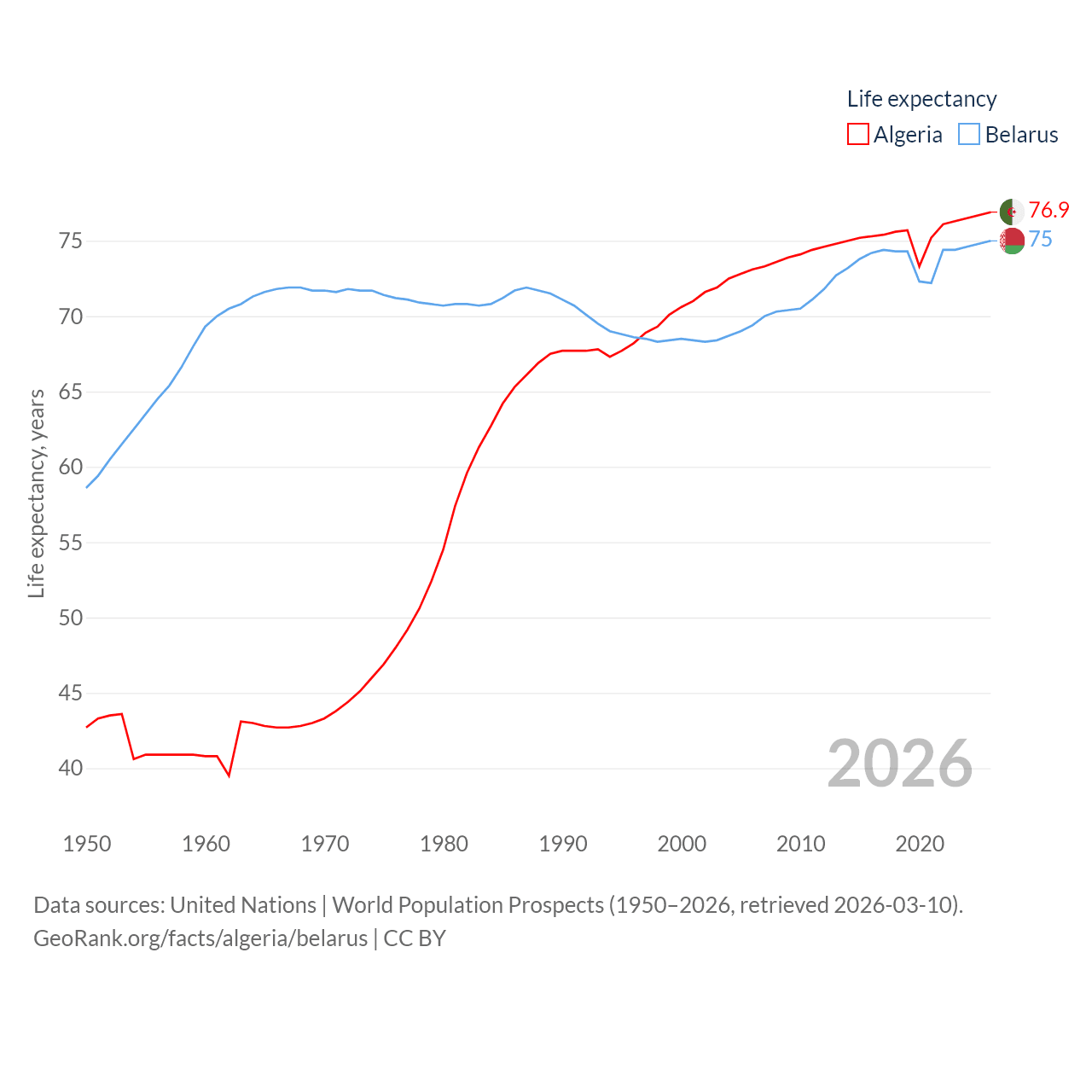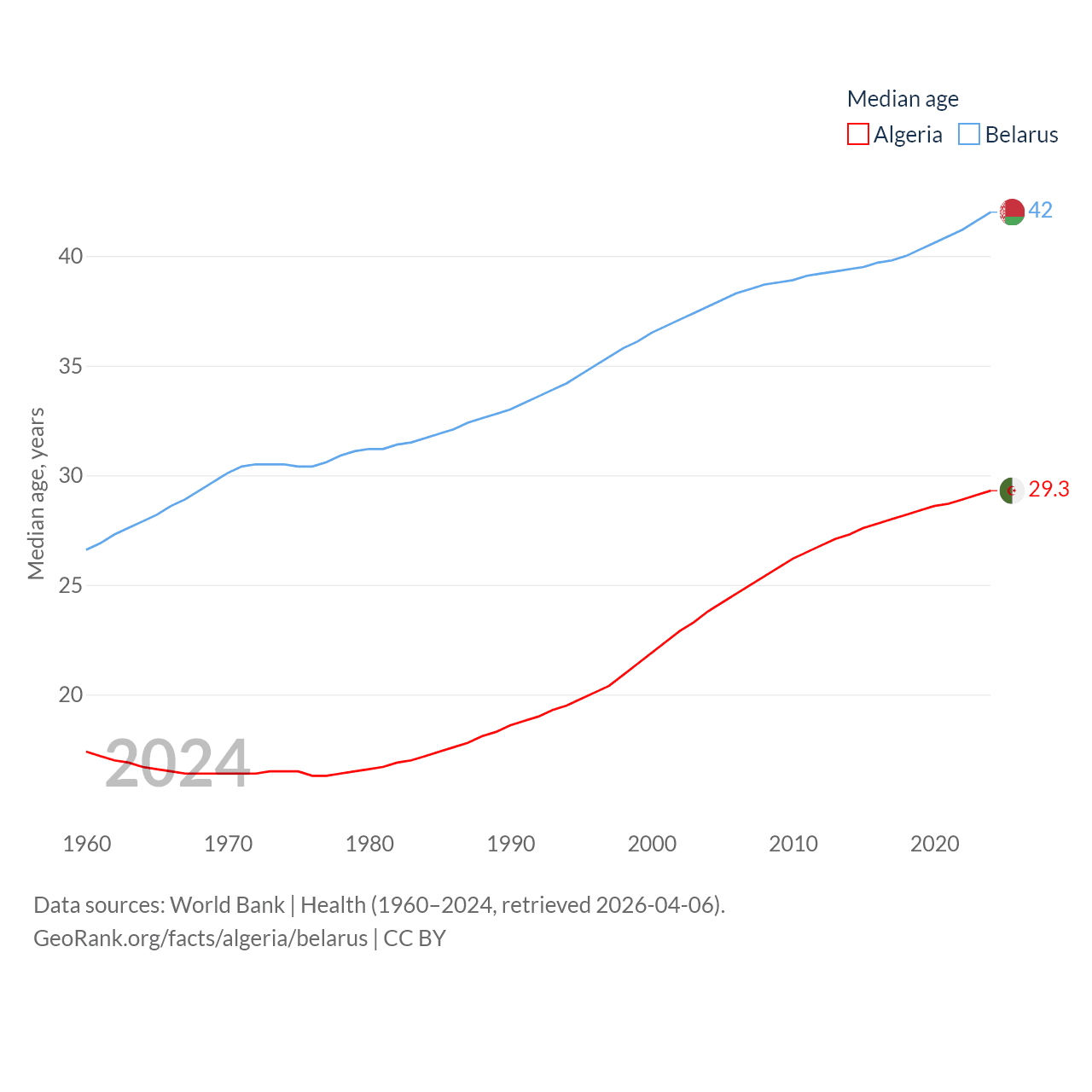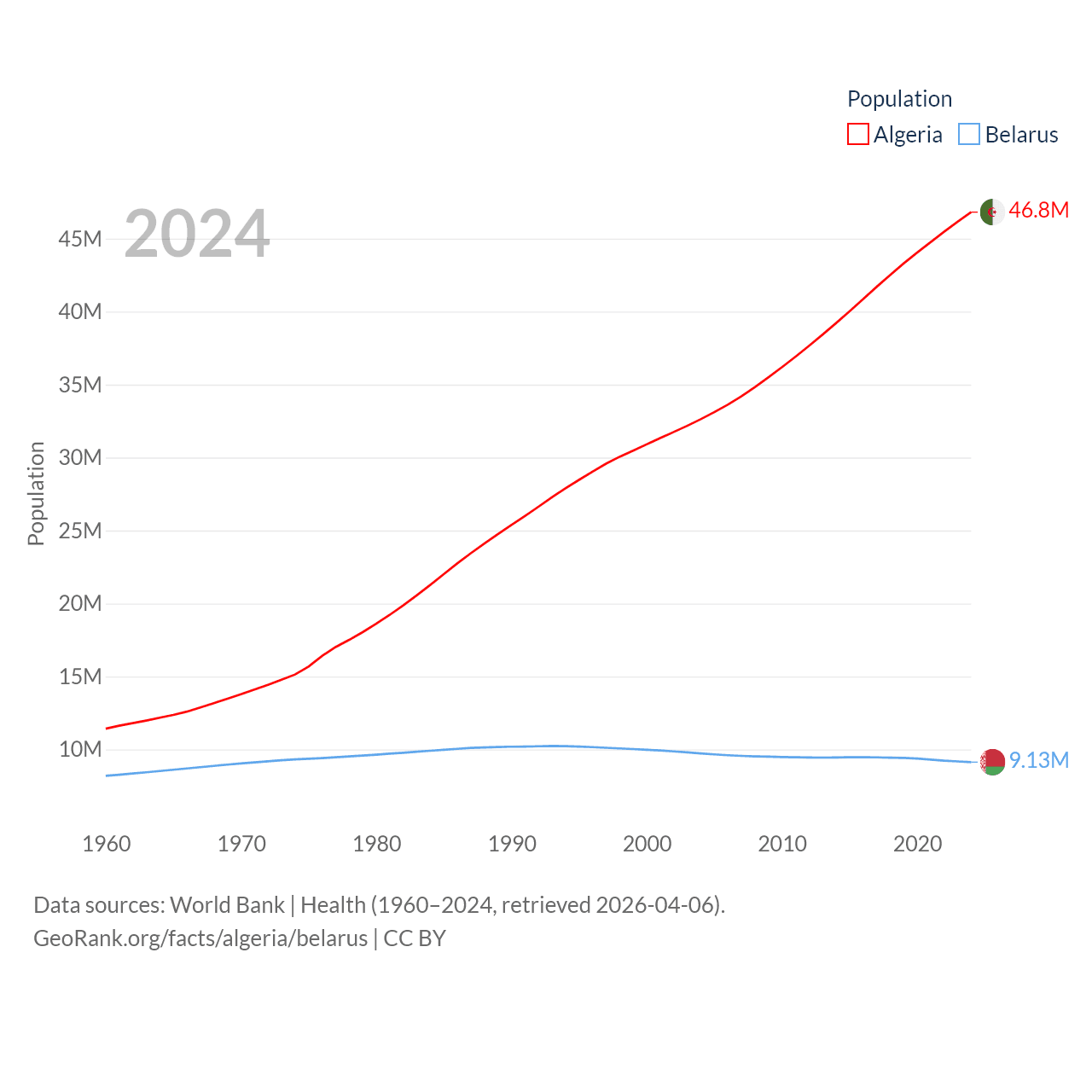 Algeria has a population of 46.8M (ranked 33/197), compared with 9.13M in Belarus (ranked 100/197). Algeria's land area is 919,595 sq mi versus 78,372 sq mi for Belarus (ranked 10th vs. 83rd).