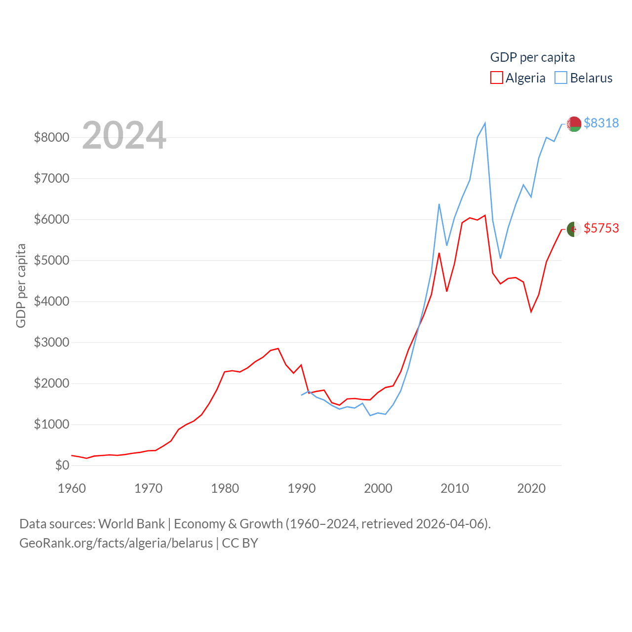 By GDP, Algeria ranks 51/197 ($269B) and Belarus ranks 83/197 ($76B). By GDP per capita, Algeria ranks 114/197 ($5,753), while Belarus ranks 92/197 ($8,318).