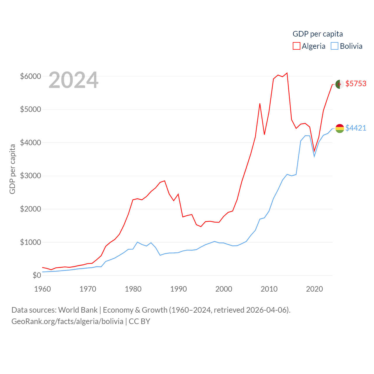 By GDP, Algeria ranks 51/197 ($269B) and Bolivia ranks 88/197 ($54.9B). By GDP per capita, Algeria ranks 114/197 ($5,753), while Bolivia ranks 125/197 ($4,421).