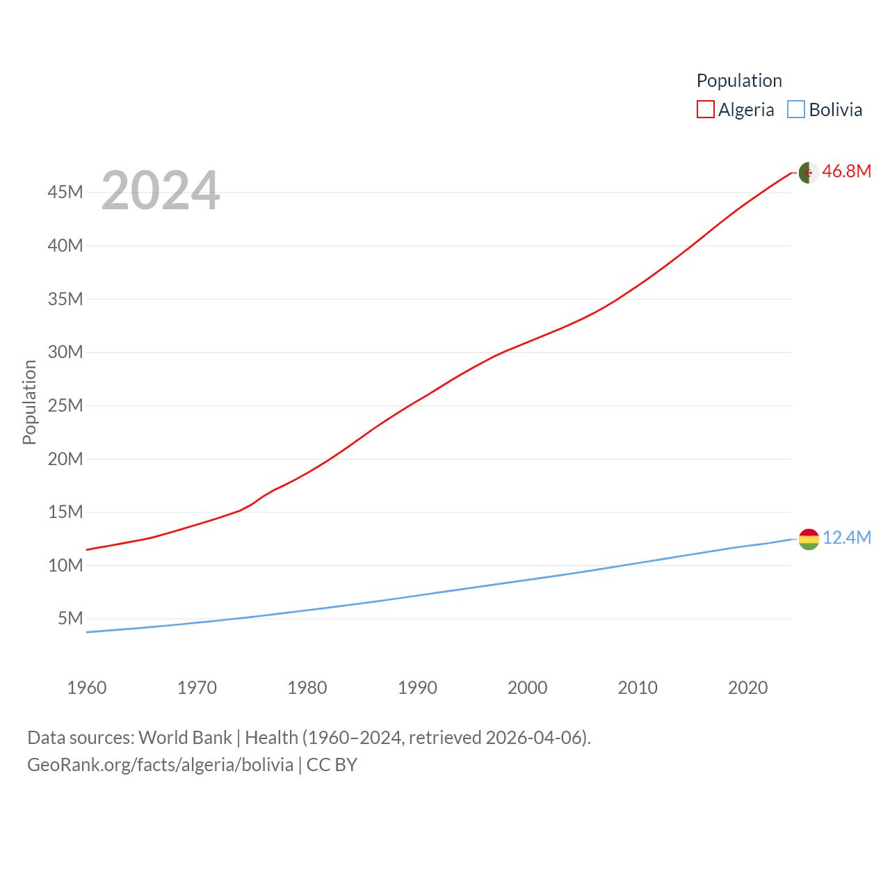 Algeria has a population of 46.8M (ranked 33/197), compared with 12.4M in Bolivia (ranked 79/197). Algeria's land area is 919,595 sq mi versus 418,264 sq mi for Bolivia (ranked 10th vs. 27th).