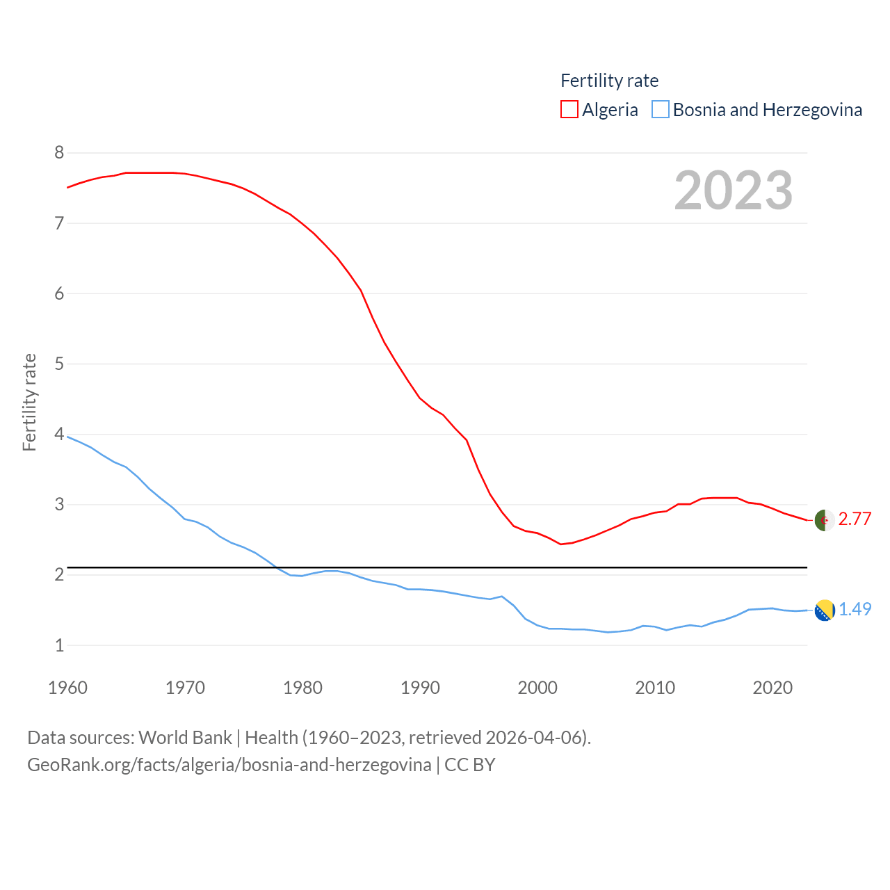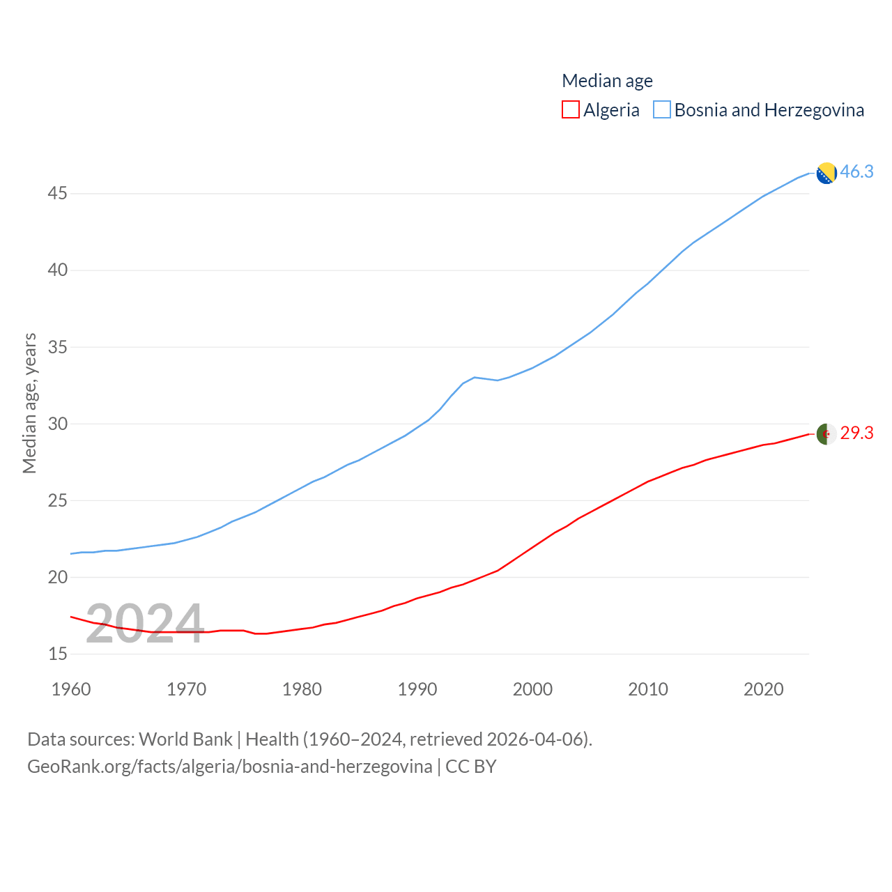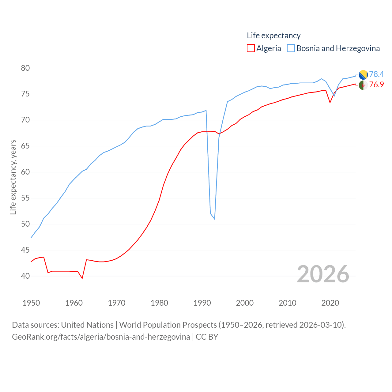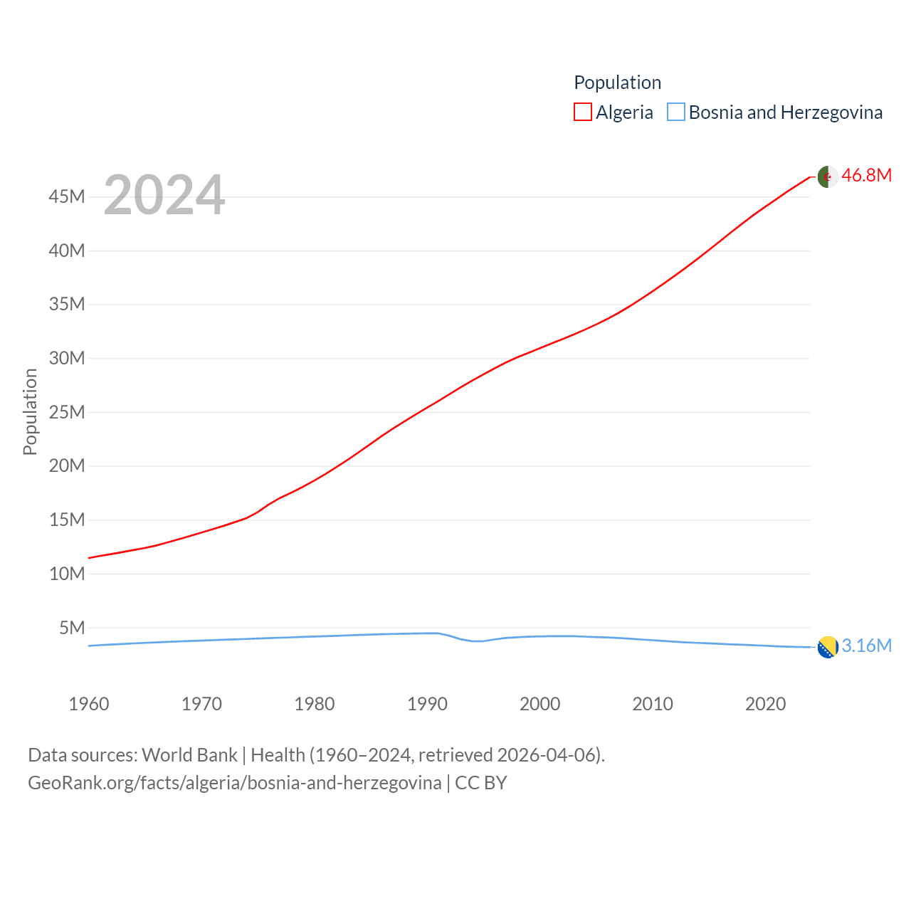 Algeria has a population of 46.8M (ranked 33/197), compared with 3.16M in Bosnia and Herzegovina (ranked 134/197). Algeria's land area is 919,595 sq mi versus 19,768 sq mi for Bosnia and Herzegovina (ranked 10th vs. 125th).
