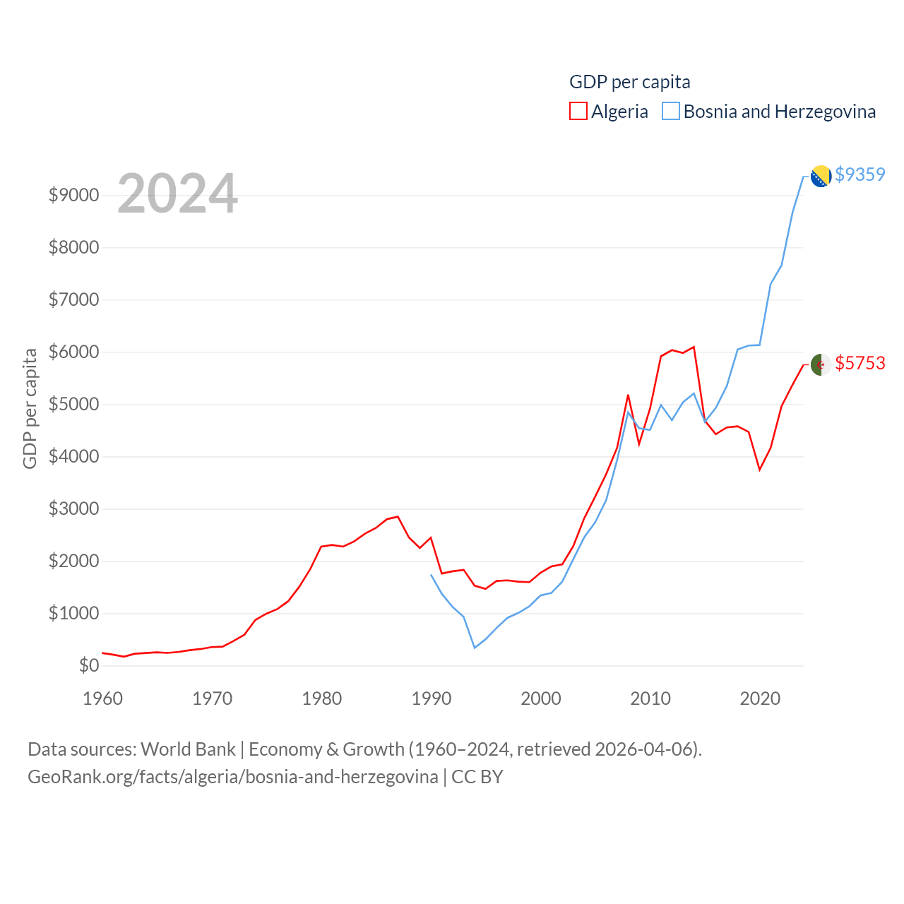 By GDP, Algeria ranks 51/197 ($269B) and Bosnia and Herzegovina ranks 111/197 ($29.6B). By GDP per capita, Algeria ranks 114/197 ($5,753), while Bosnia and Herzegovina ranks 87/197 ($9,359).