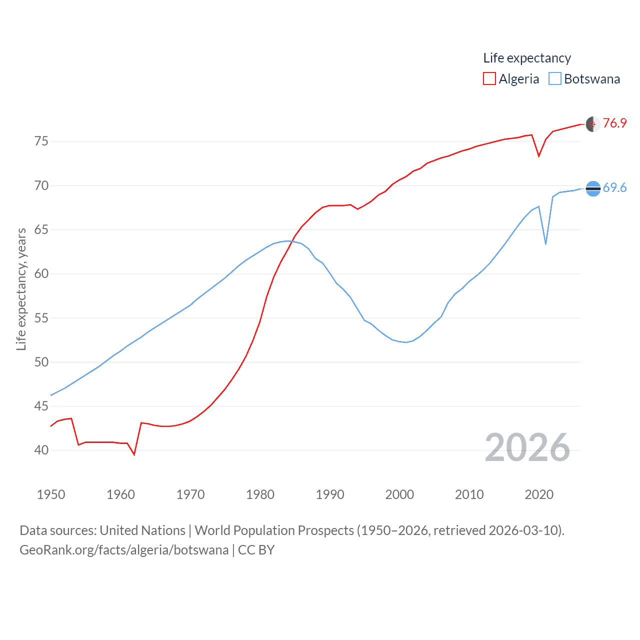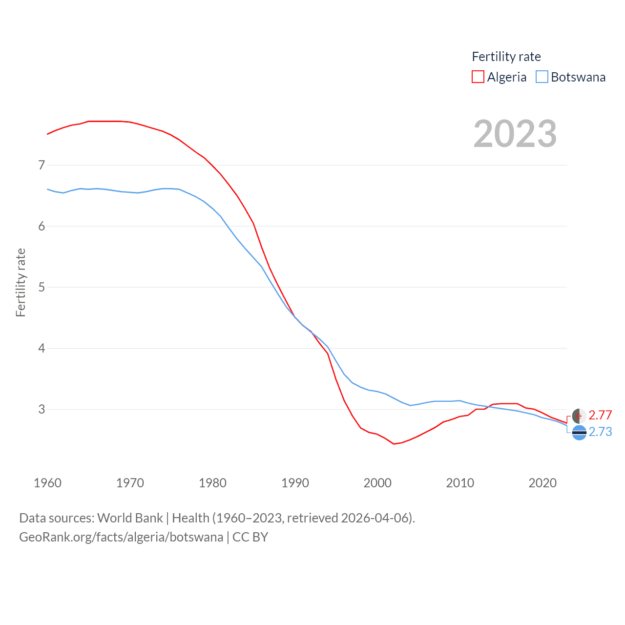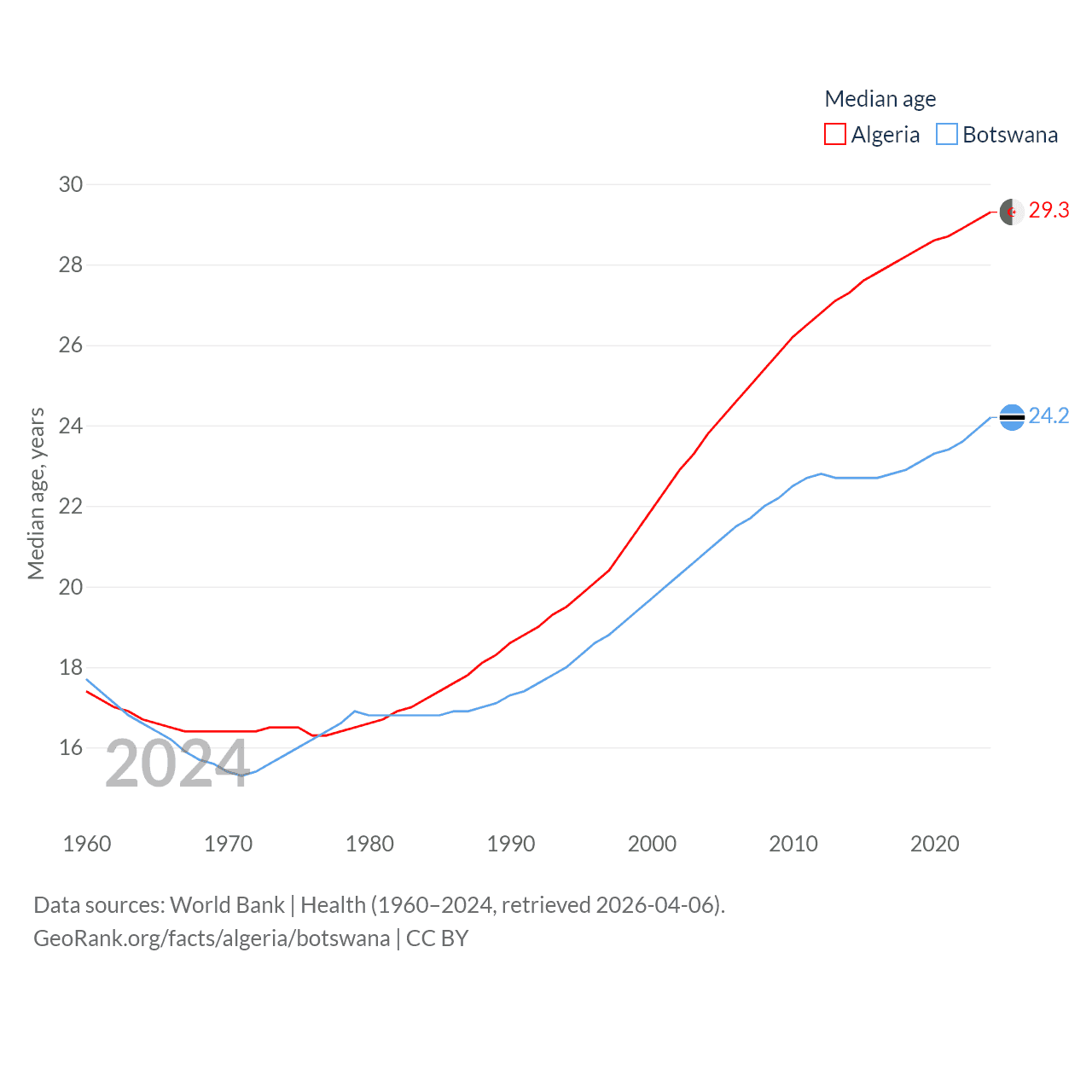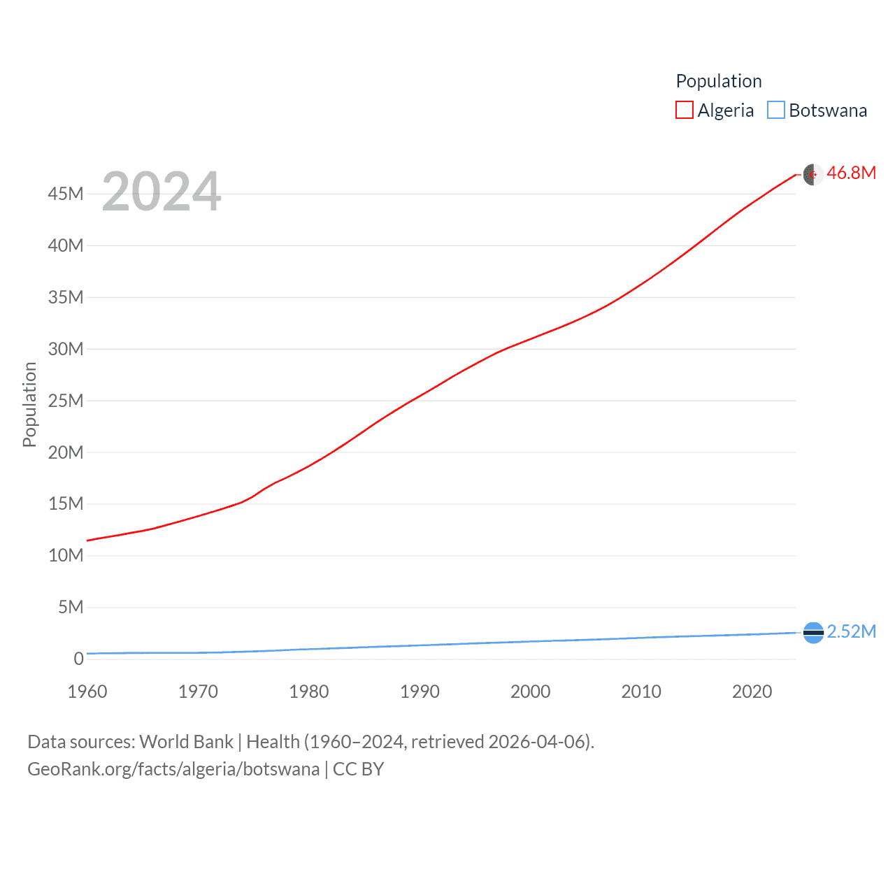 Algeria has a population of 46.8M (ranked 33/197), compared with 2.52M in Botswana (ranked 142/197). Algeria's land area is 919,595 sq mi versus 218,816 sq mi for Botswana (ranked 10th vs. 47th).