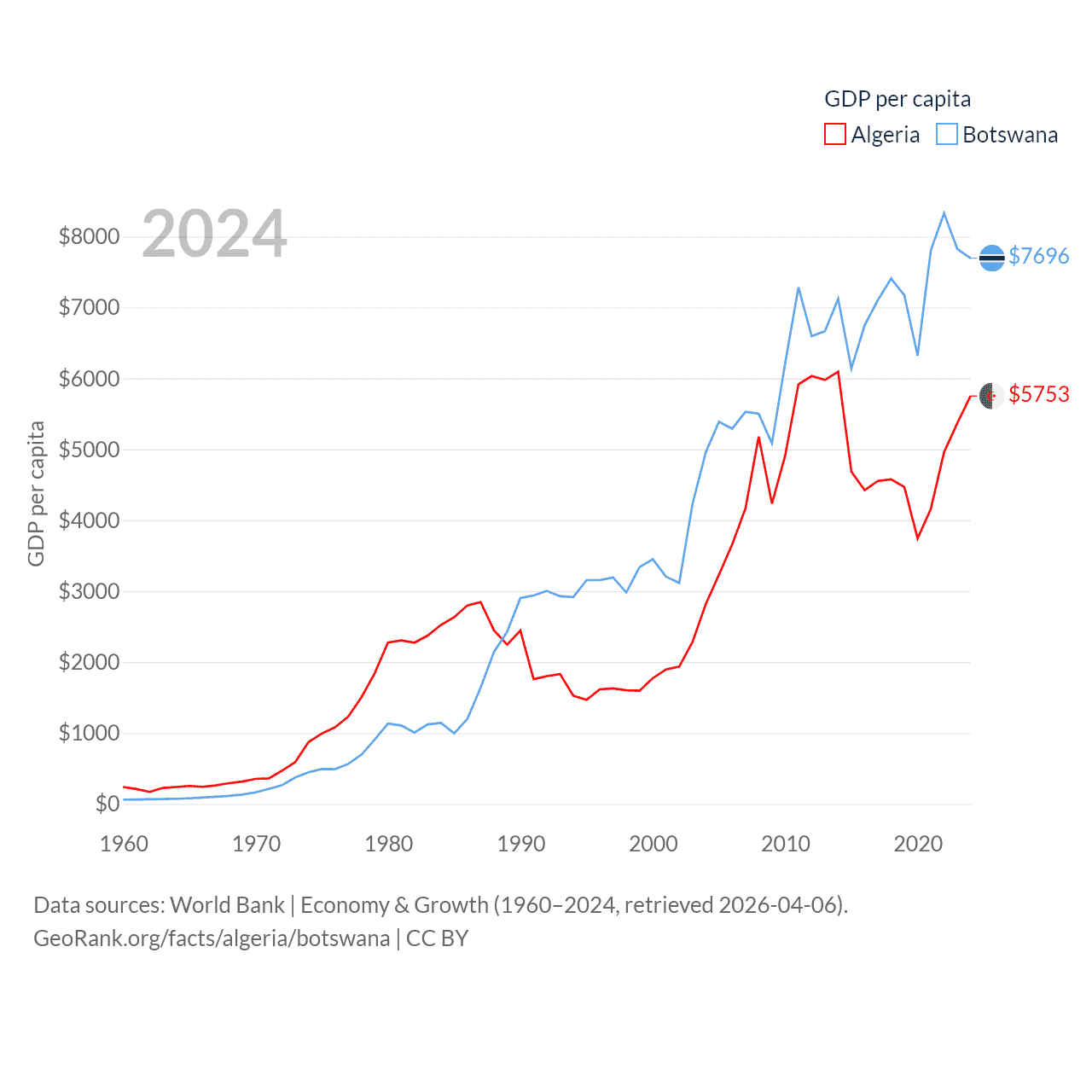 By GDP, Algeria ranks 51/197 ($269B) and Botswana ranks 133/197 ($19.4B). By GDP per capita, Algeria ranks 114/197 ($5,753), while Botswana ranks 97/197 ($7,696).