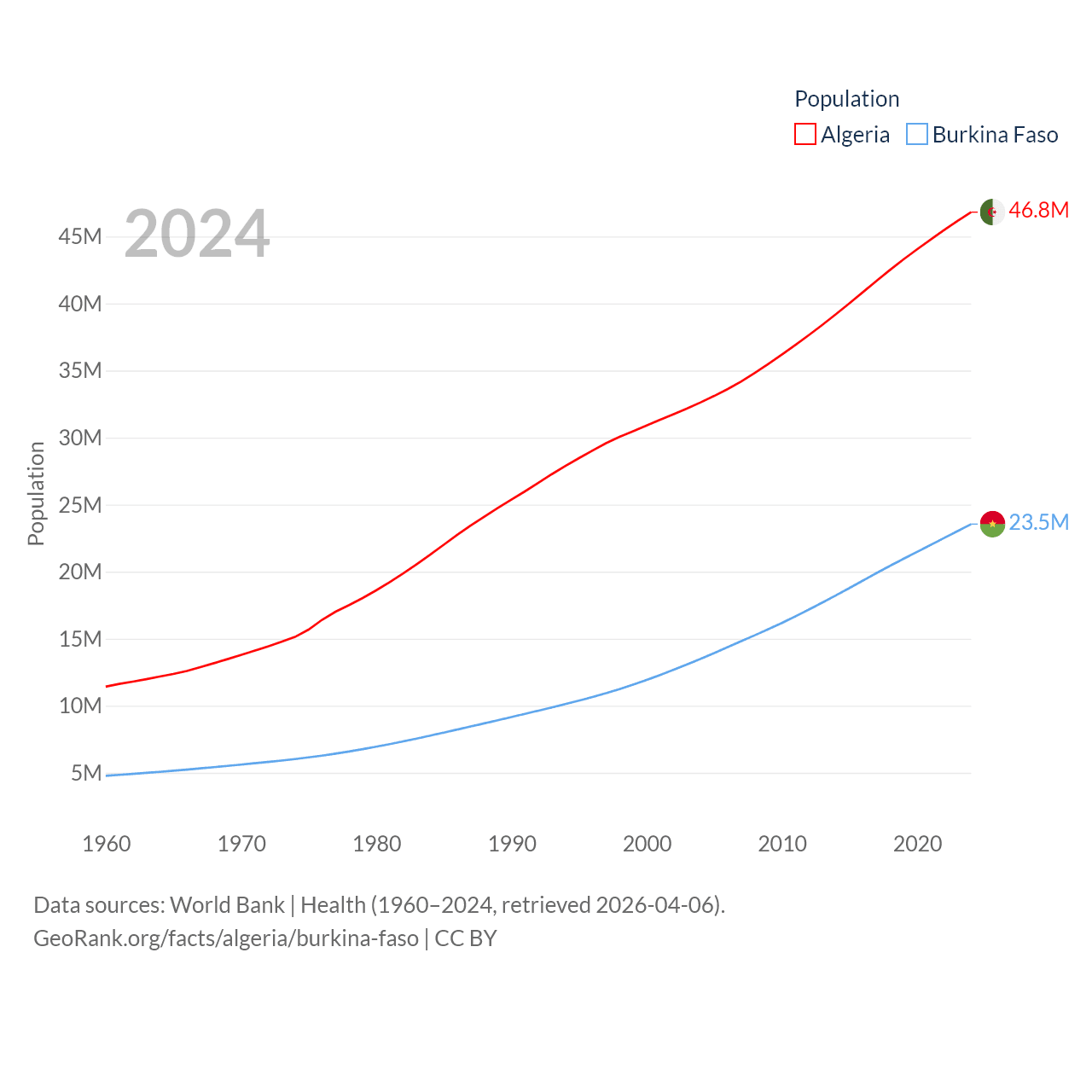 Algeria has a population of 46.8M (ranked 33/197), compared with 23.5M in Burkina Faso (ranked 59/197). Algeria's land area is 919,595 sq mi versus 105,638 sq mi for Burkina Faso (ranked 10th vs. 73rd).