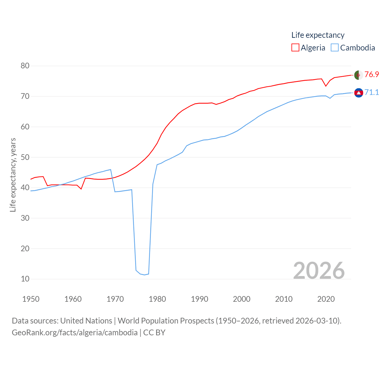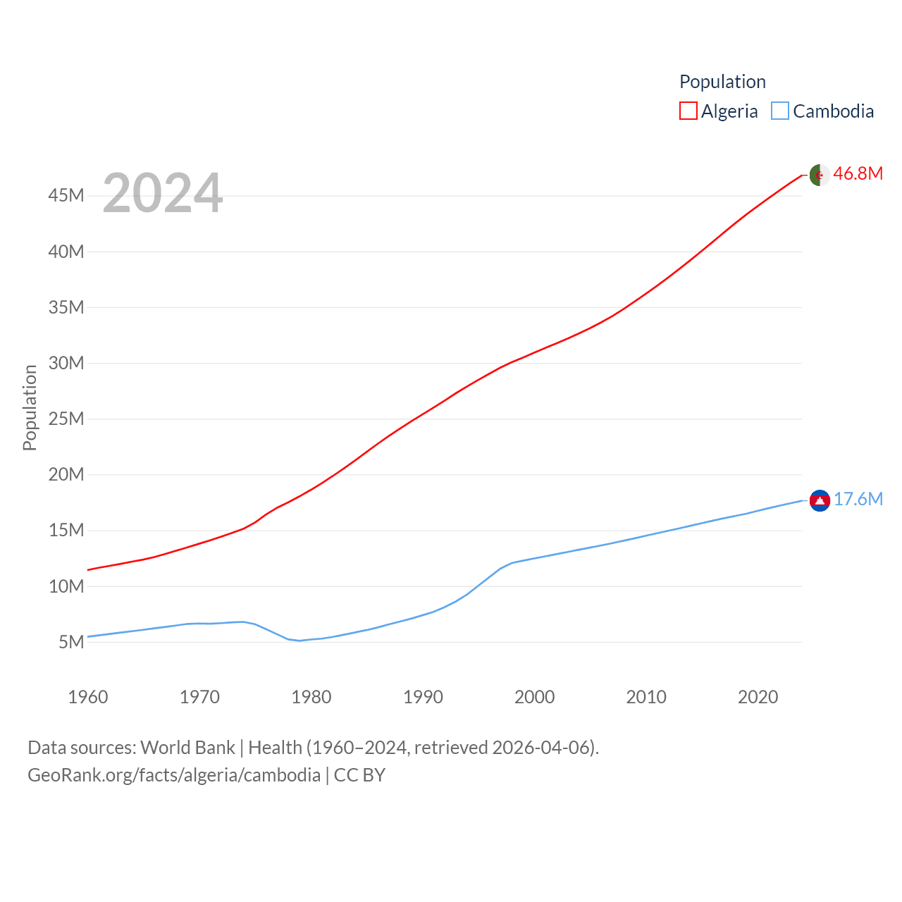 Algeria has a population of 46.8M (ranked 33/197), compared with 17.6M in Cambodia (ranked 73/197). Algeria's land area is 919,595 sq mi versus 68,155 sq mi for Cambodia (ranked 10th vs. 88th).