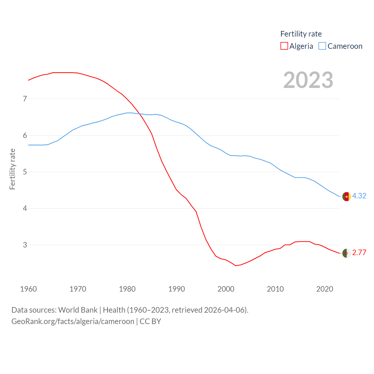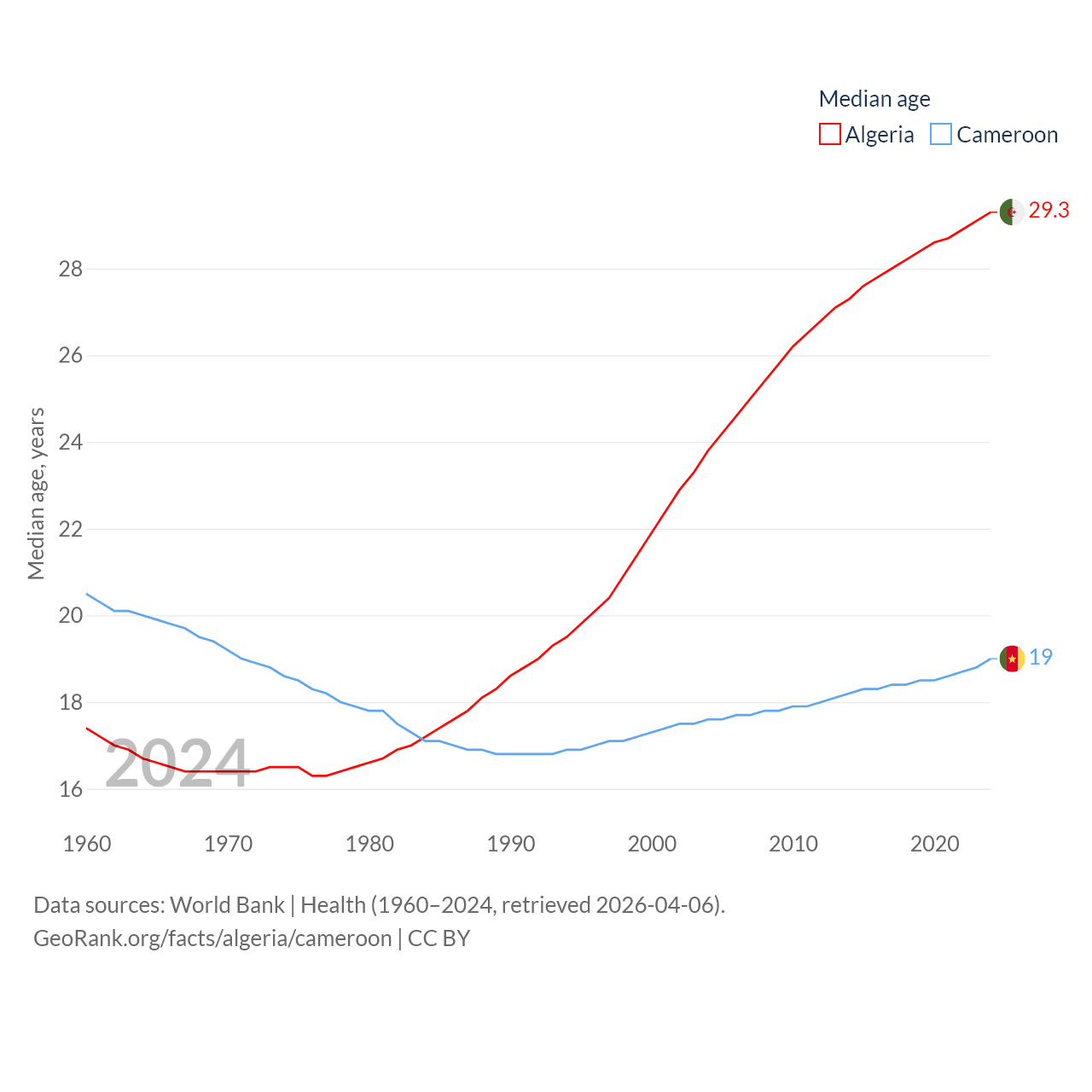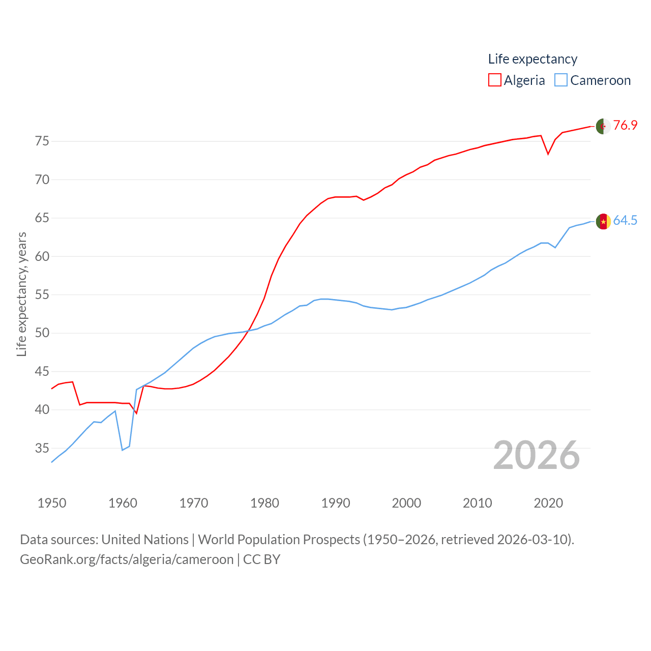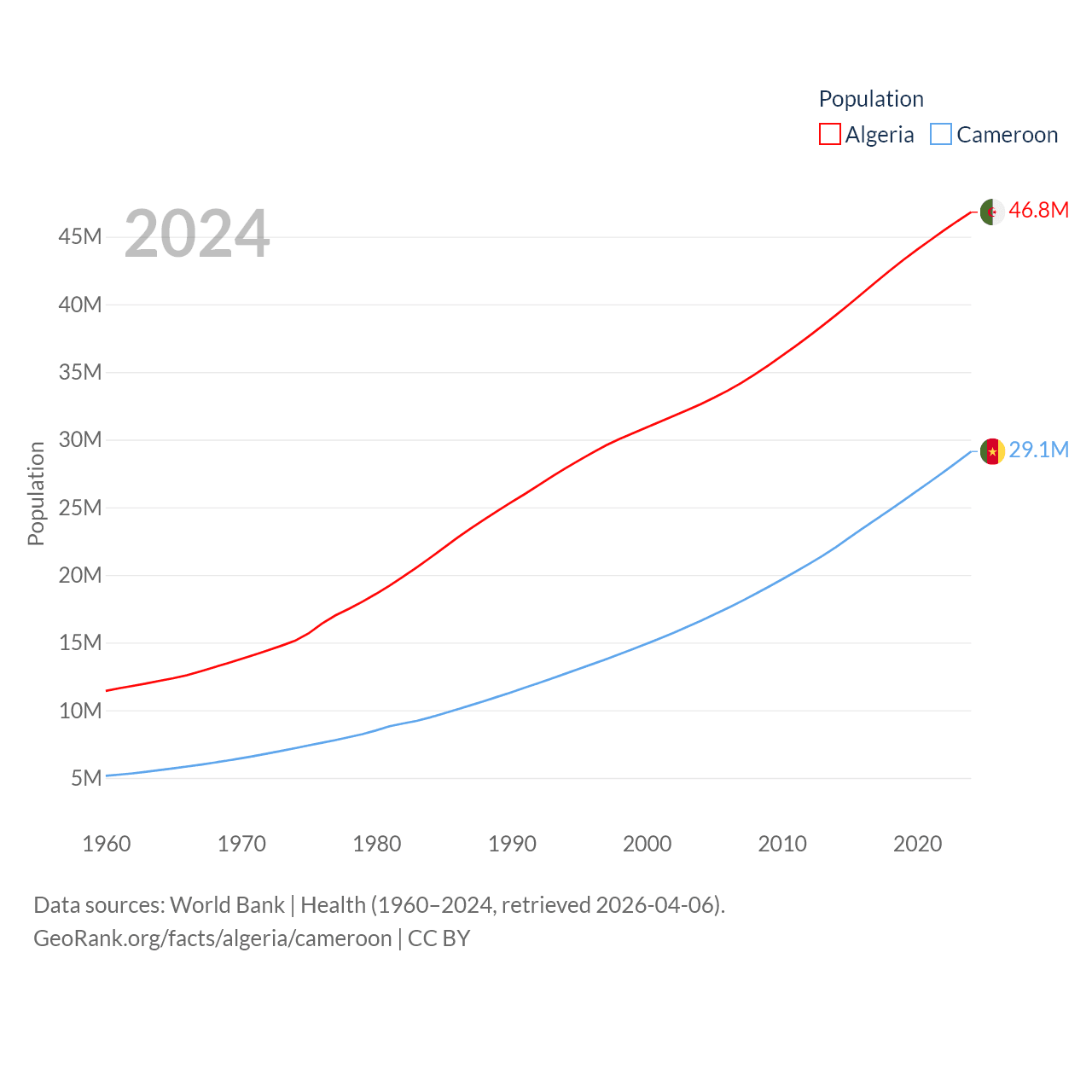 Algeria has a population of 46.8M (ranked 33/197), compared with 29.1M in Cameroon (ranked 52/197). Algeria's land area is 919,595 sq mi versus 182,514 sq mi for Cameroon (ranked 10th vs. 52nd).