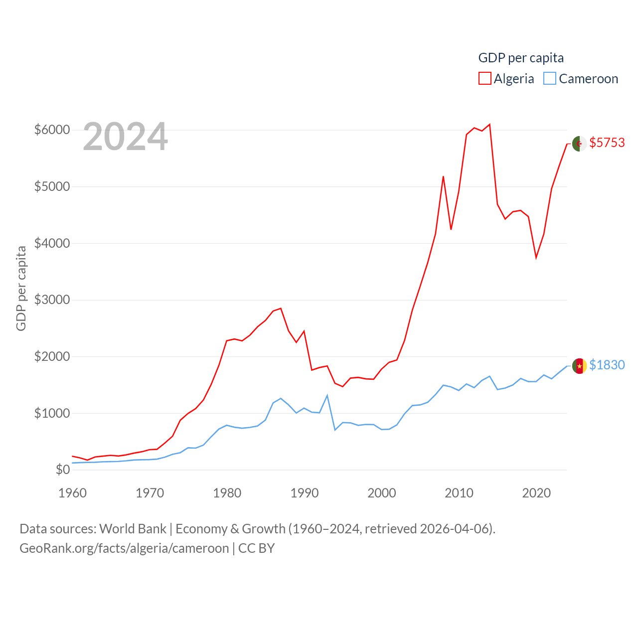 By GDP, Algeria ranks 51/197 ($269B) and Cameroon ranks 91/197 ($53.3B). By GDP per capita, Algeria ranks 114/197 ($5,753), while Cameroon ranks 158/197 ($1,830).