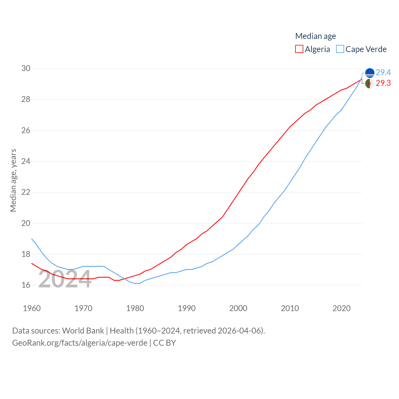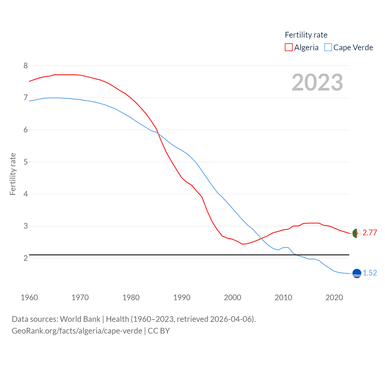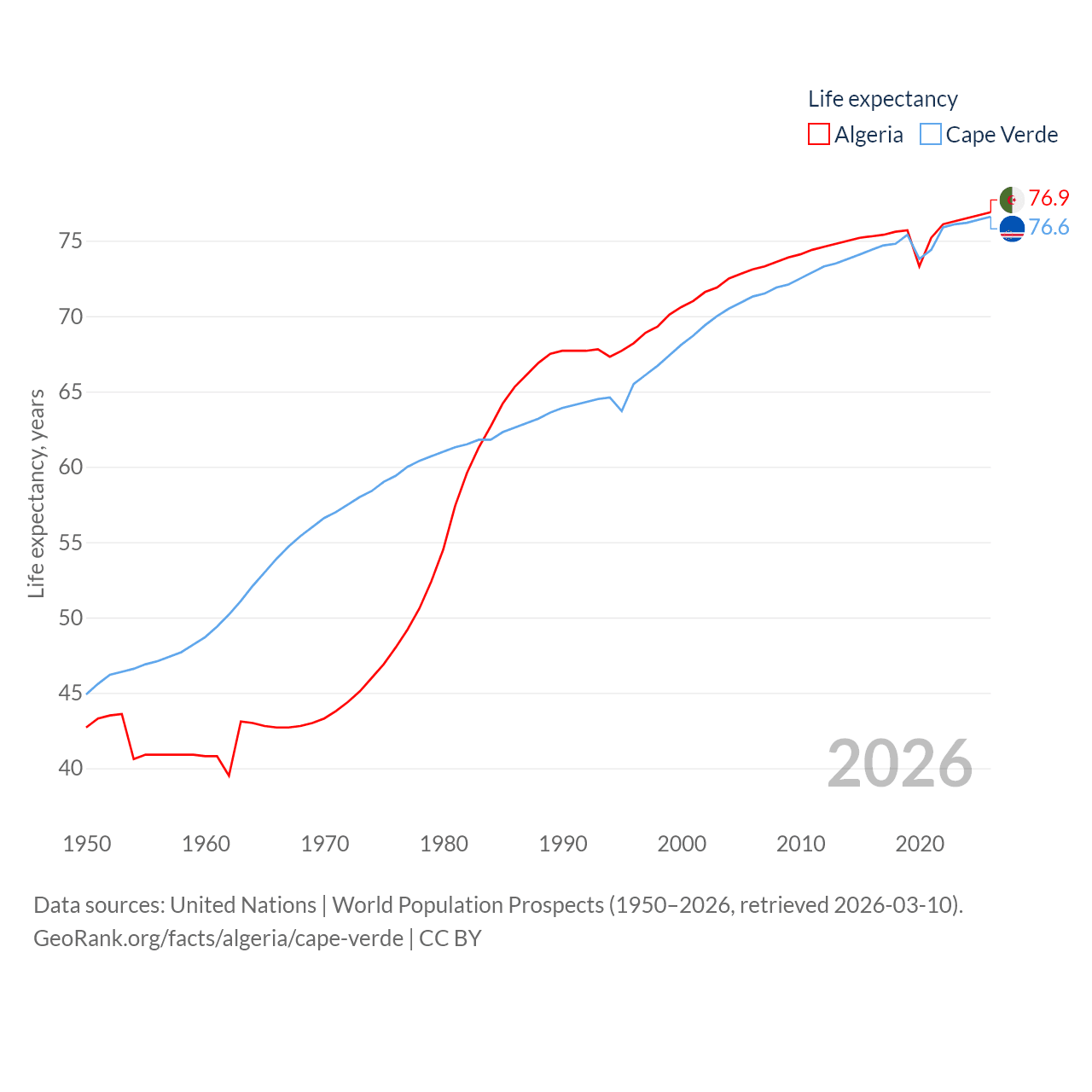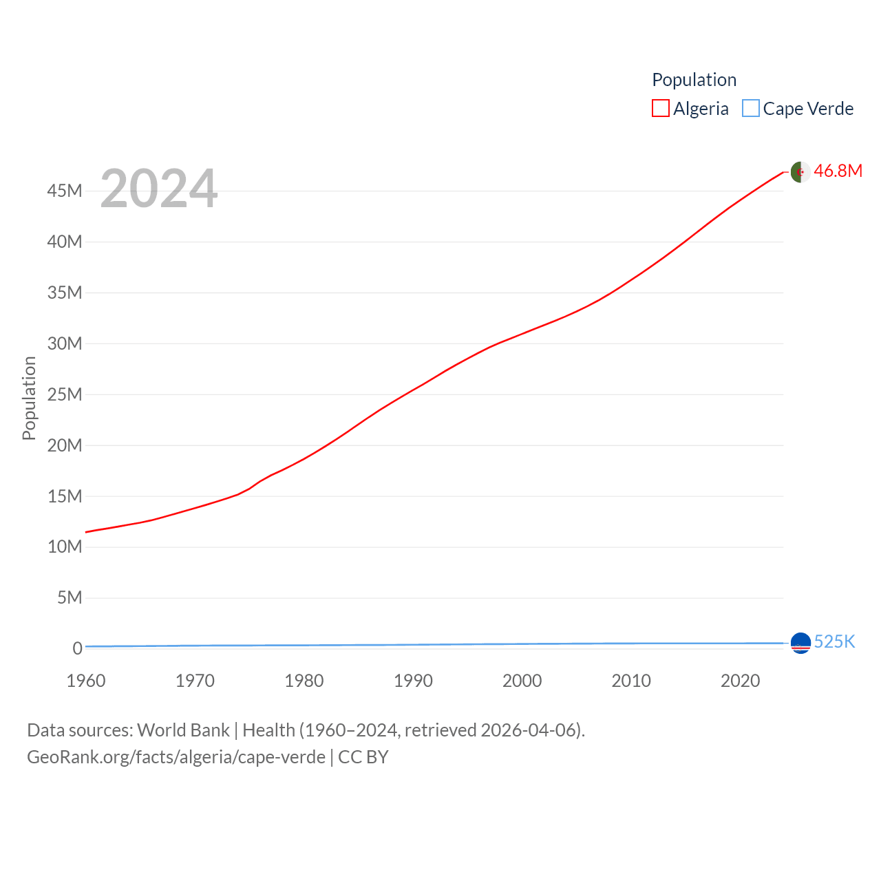 Algeria has a population of 46.8M (ranked 33/197), compared with 525K in Cape Verde (ranked 169/197). Algeria's land area is 919,595 sq mi versus 1,556 sq mi for Cape Verde (ranked 10th vs. 167th).