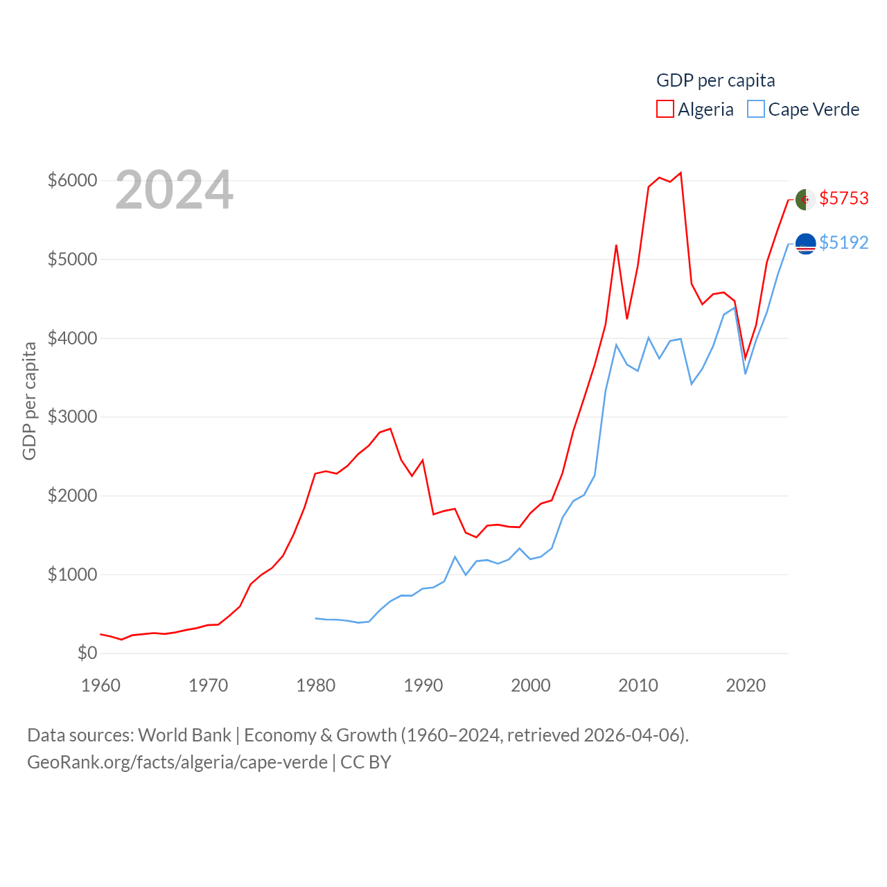 By GDP, Algeria ranks 51/197 ($269B) and Cape Verde ranks 172/197 ($2.73B). By GDP per capita, Algeria ranks 114/197 ($5,753), while Cape Verde ranks 118/197 ($5,192).