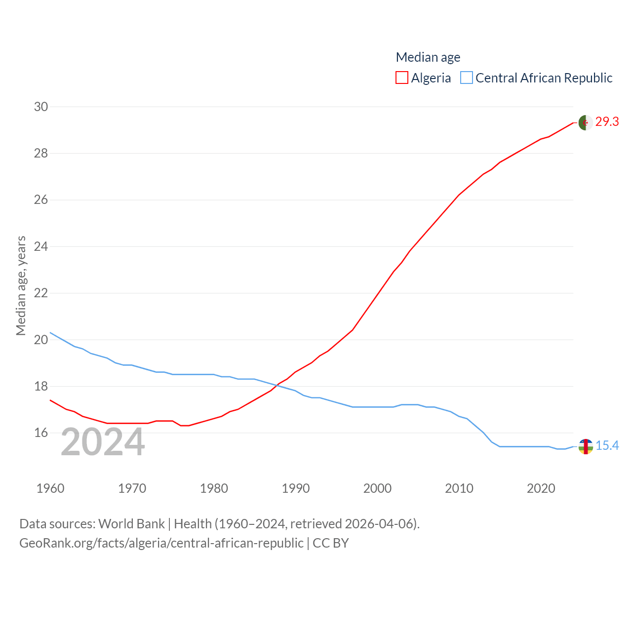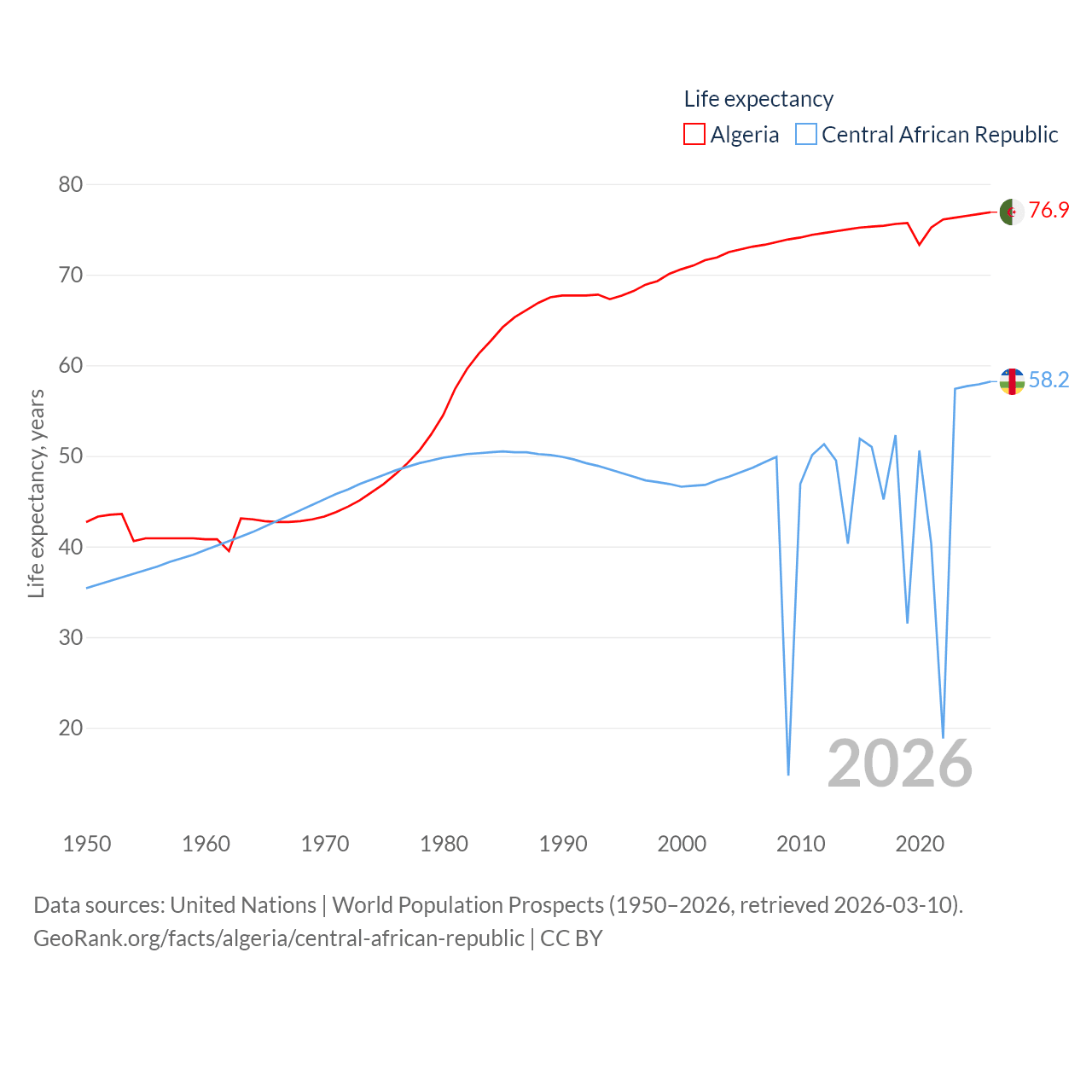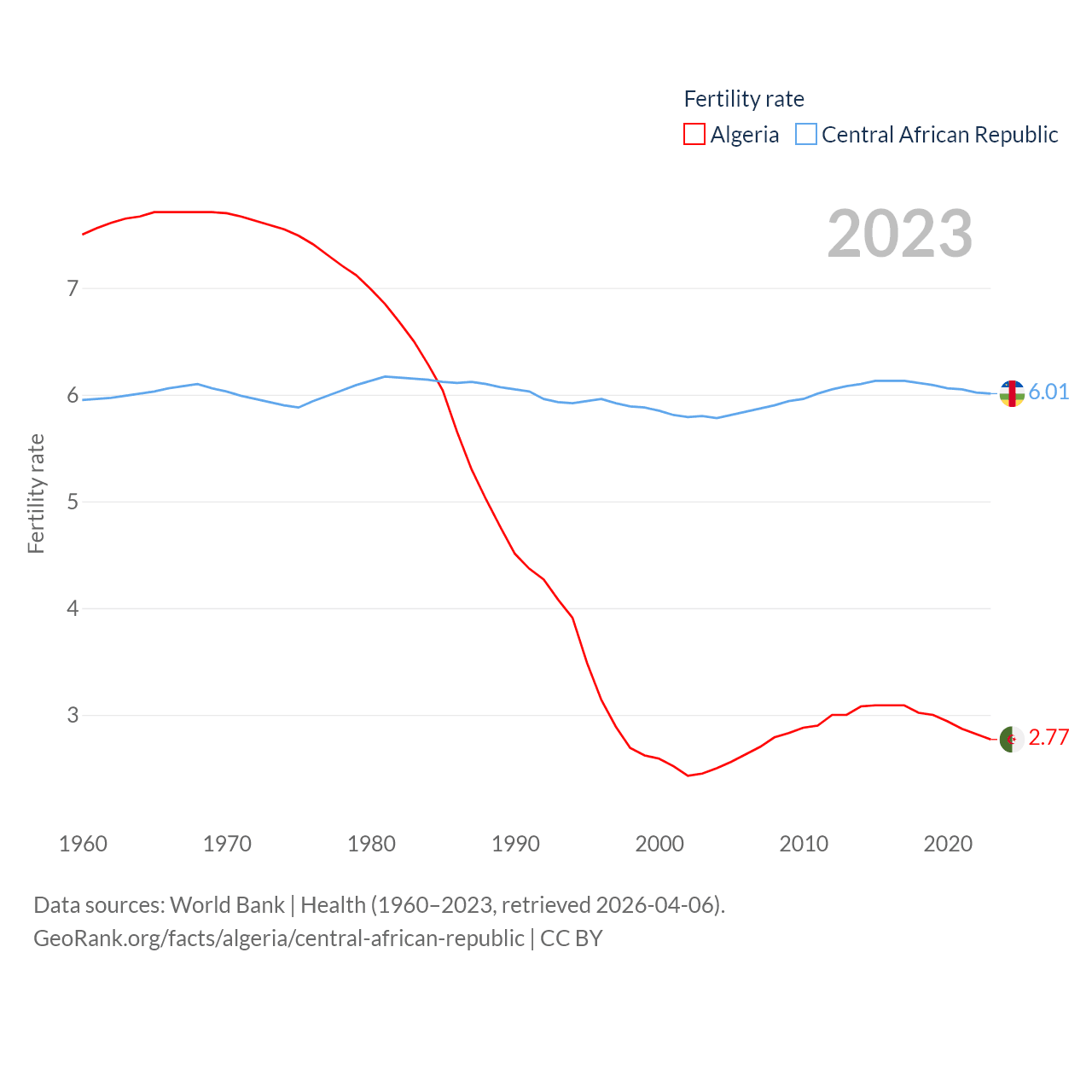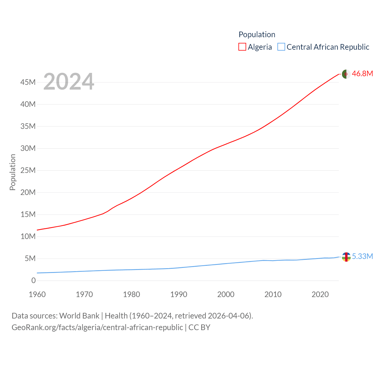 Algeria has a population of 46.8M (ranked 33/197), compared with 5.33M in The Central African Republic (ranked 121/197). Algeria's land area is 919,595 sq mi versus 240,534 sq mi for The Central African Republic (ranked 10th vs. 43rd).