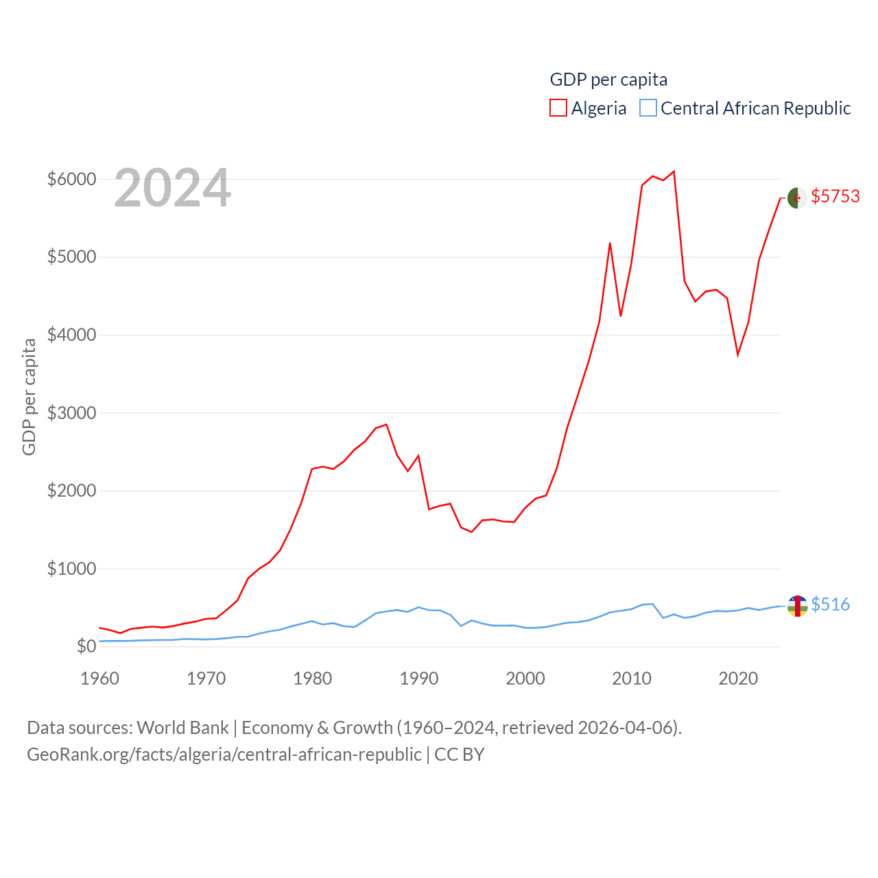 By GDP, Algeria ranks 51/197 ($269B) and The Central African Republic ranks 171/197 ($2.75B). By GDP per capita, Algeria ranks 114/197 ($5,753), while The Central African Republic ranks 195/197 ($516).