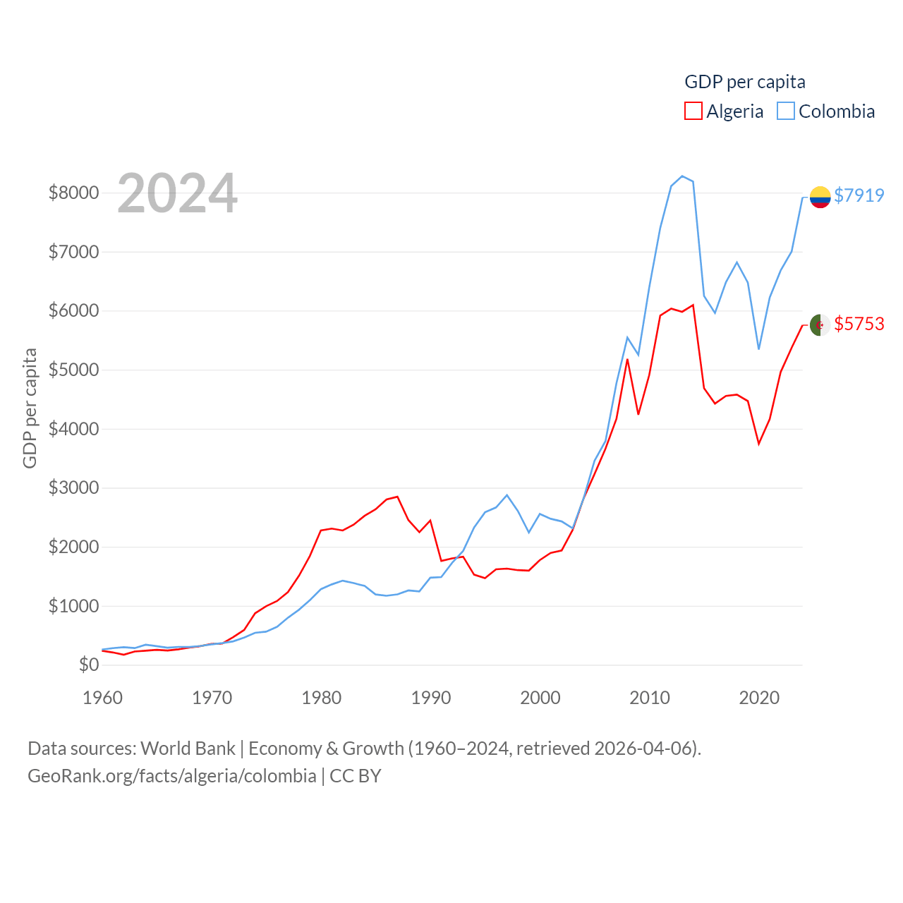 By GDP, Algeria ranks 51/197 ($269B) and Colombia ranks 39/197 ($419B). By GDP per capita, Algeria ranks 114/197 ($5,753), while Colombia ranks 94/197 ($7,919).