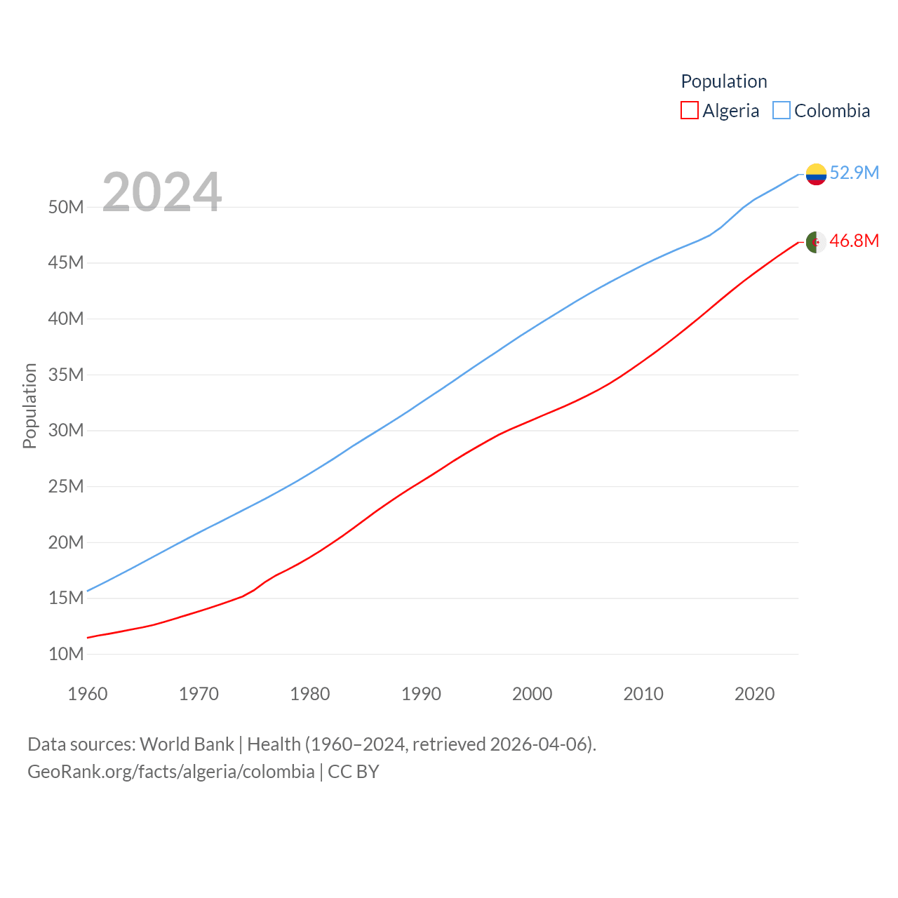 Algeria has a population of 46.8M (ranked 33/197), compared with 52.9M in Colombia (ranked 28/197). Algeria's land area is 919,595 sq mi versus 428,380 sq mi for Colombia (ranked 10th vs. 26th).