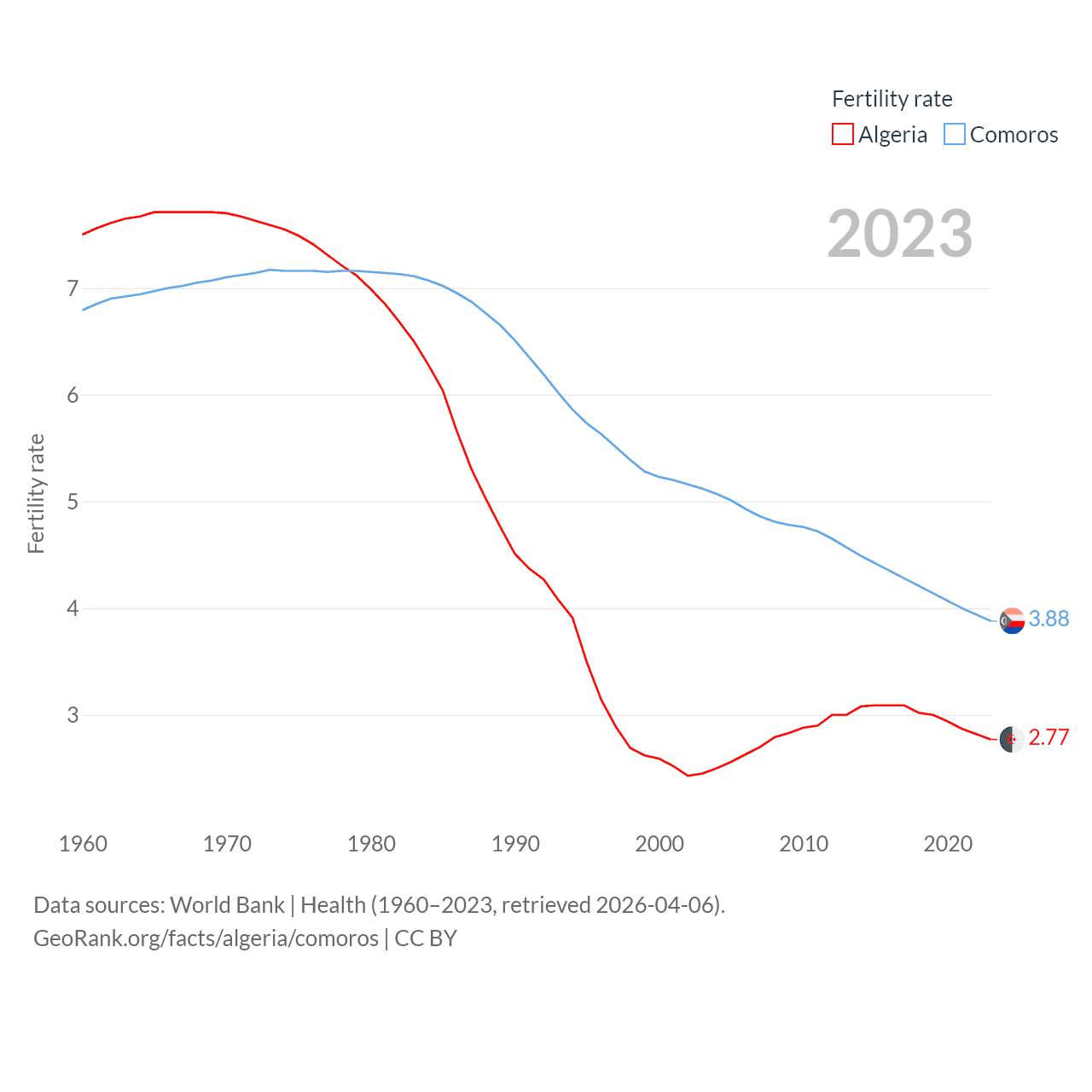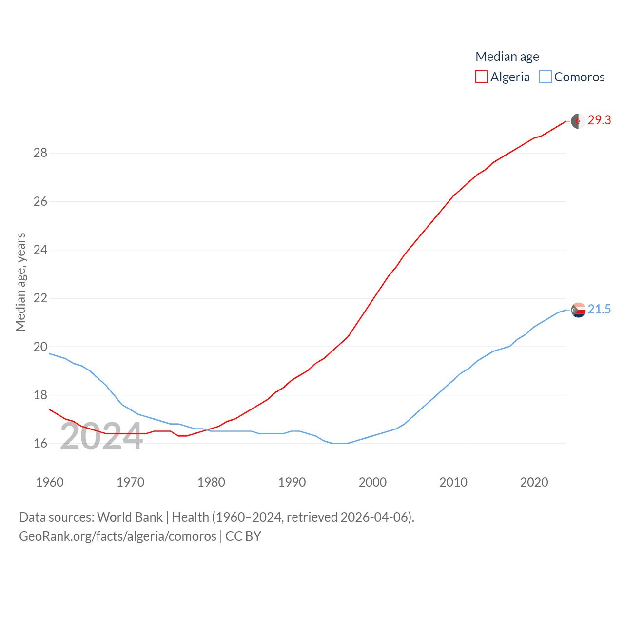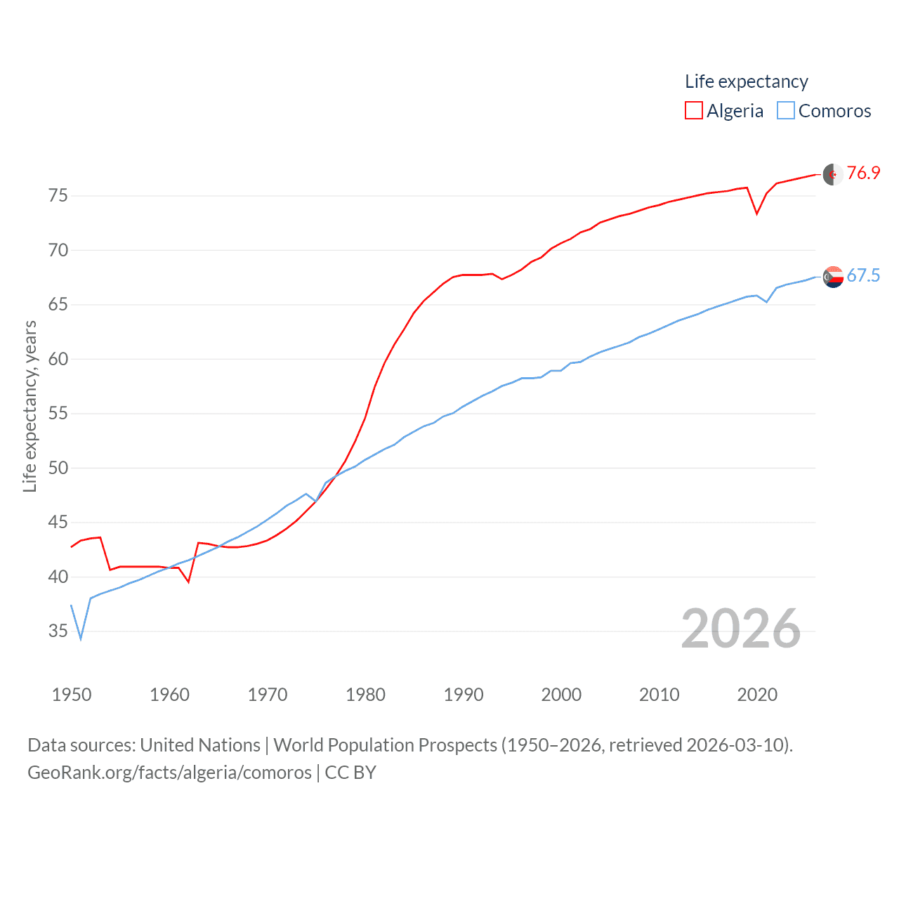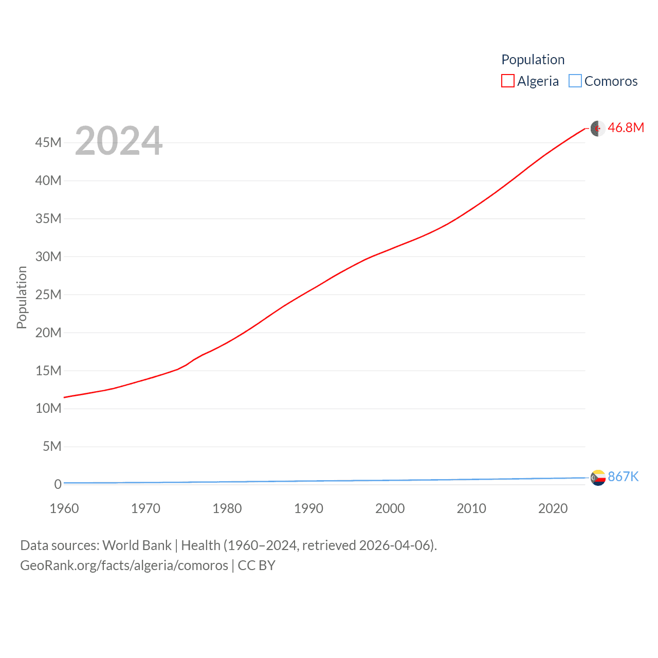 Algeria has a population of 46.8M (ranked 33/197), compared with 867K in Comoros (ranked 160/197). Algeria's land area is 919,595 sq mi versus 719 sq mi for Comoros (ranked 10th vs. 171st).
