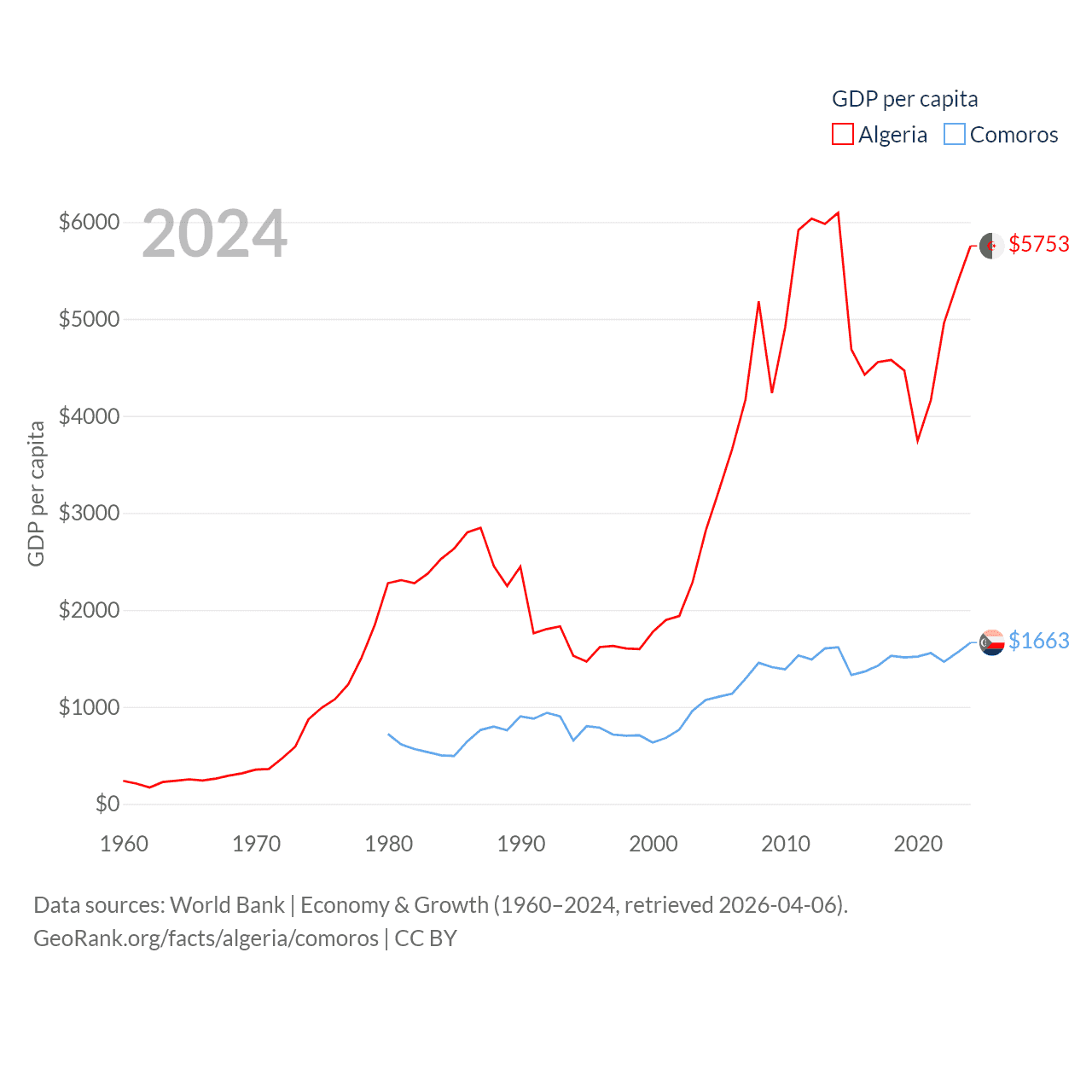 By GDP, Algeria ranks 51/197 ($269B) and Comoros ranks 183/197 ($1.44B). By GDP per capita, Algeria ranks 114/197 ($5,753), while Comoros ranks 161/197 ($1,663).