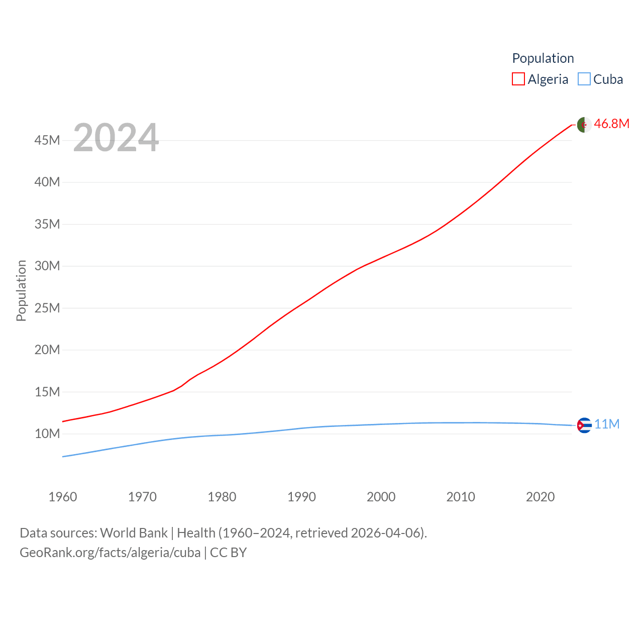 Algeria has a population of 46.8M (ranked 33/197), compared with 11M in Cuba (ranked 87/197). Algeria's land area is 919,595 sq mi versus 40,077 sq mi for Cuba (ranked 10th vs. 103rd).