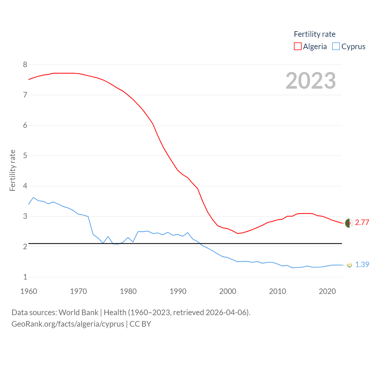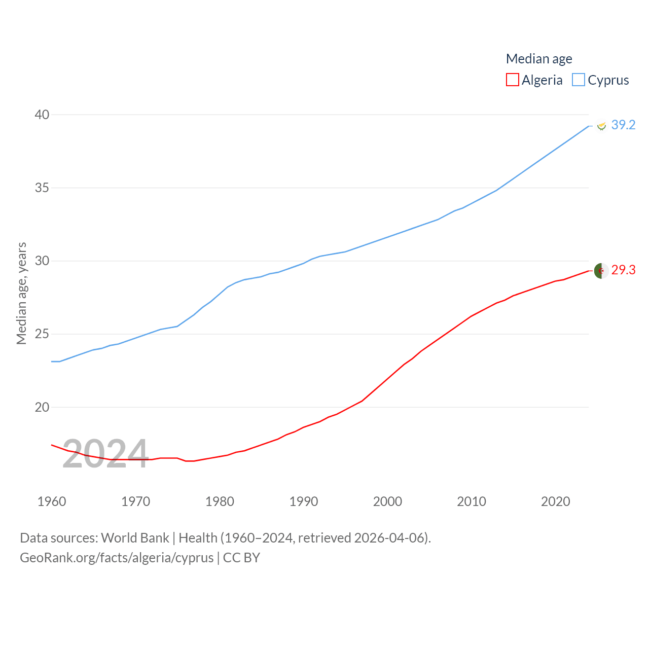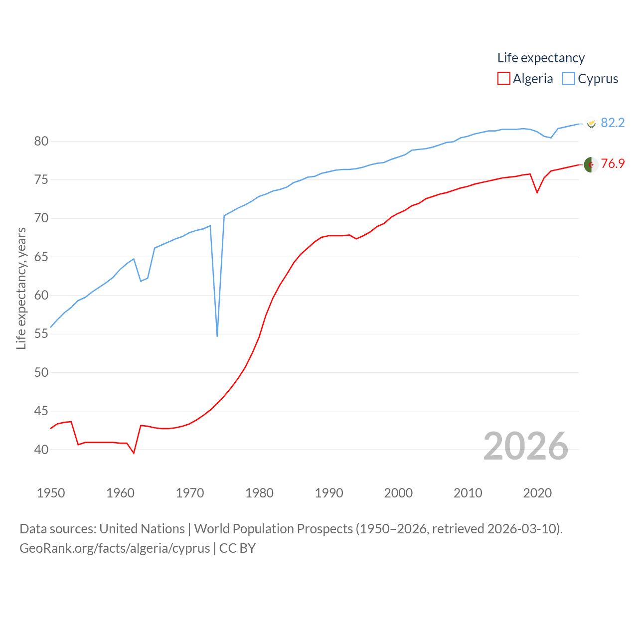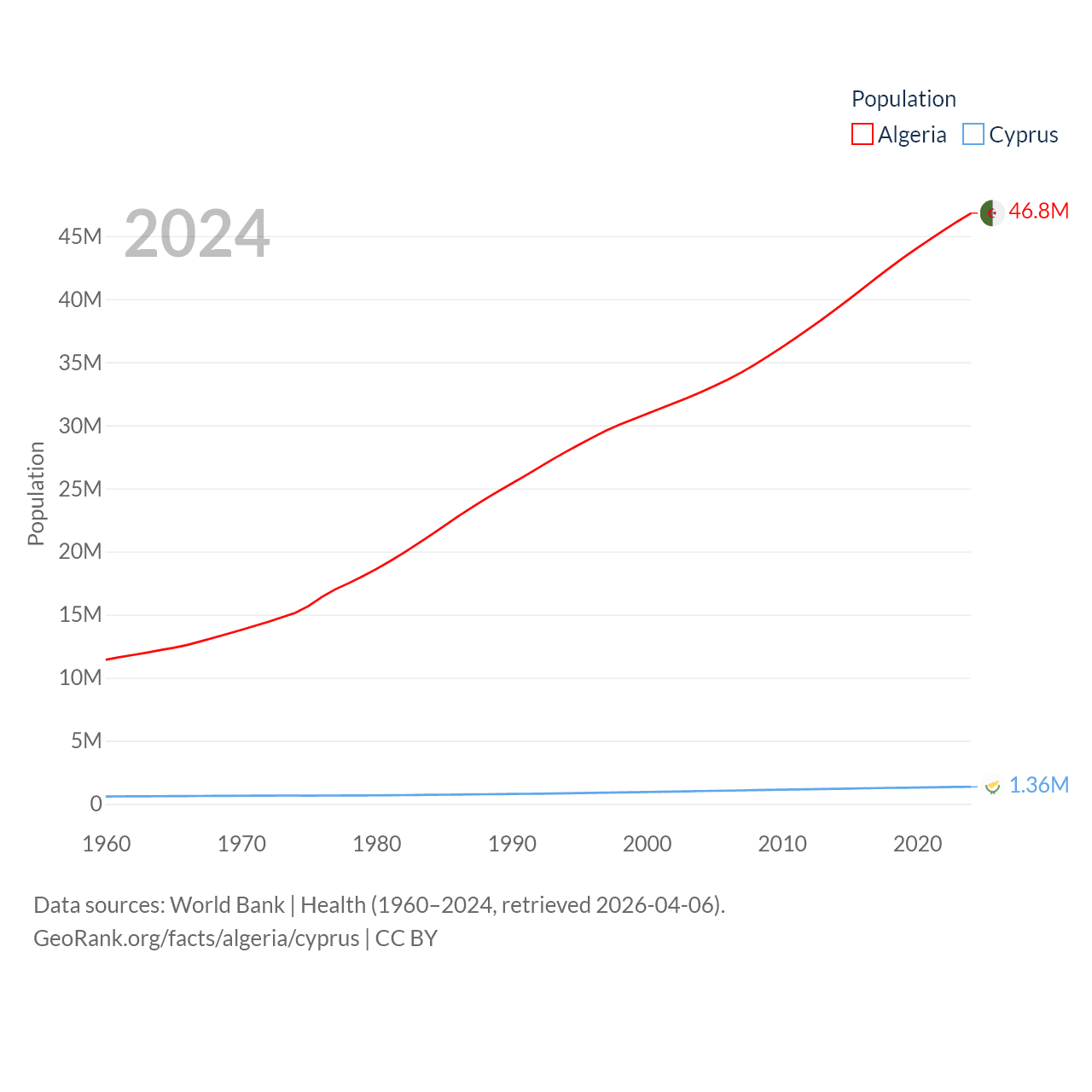 Algeria has a population of 46.8M (ranked 33/197), compared with 1.36M in Cyprus (ranked 155/197). Algeria's land area is 919,595 sq mi versus 3,568 sq mi for Cyprus (ranked 10th vs. 163rd).