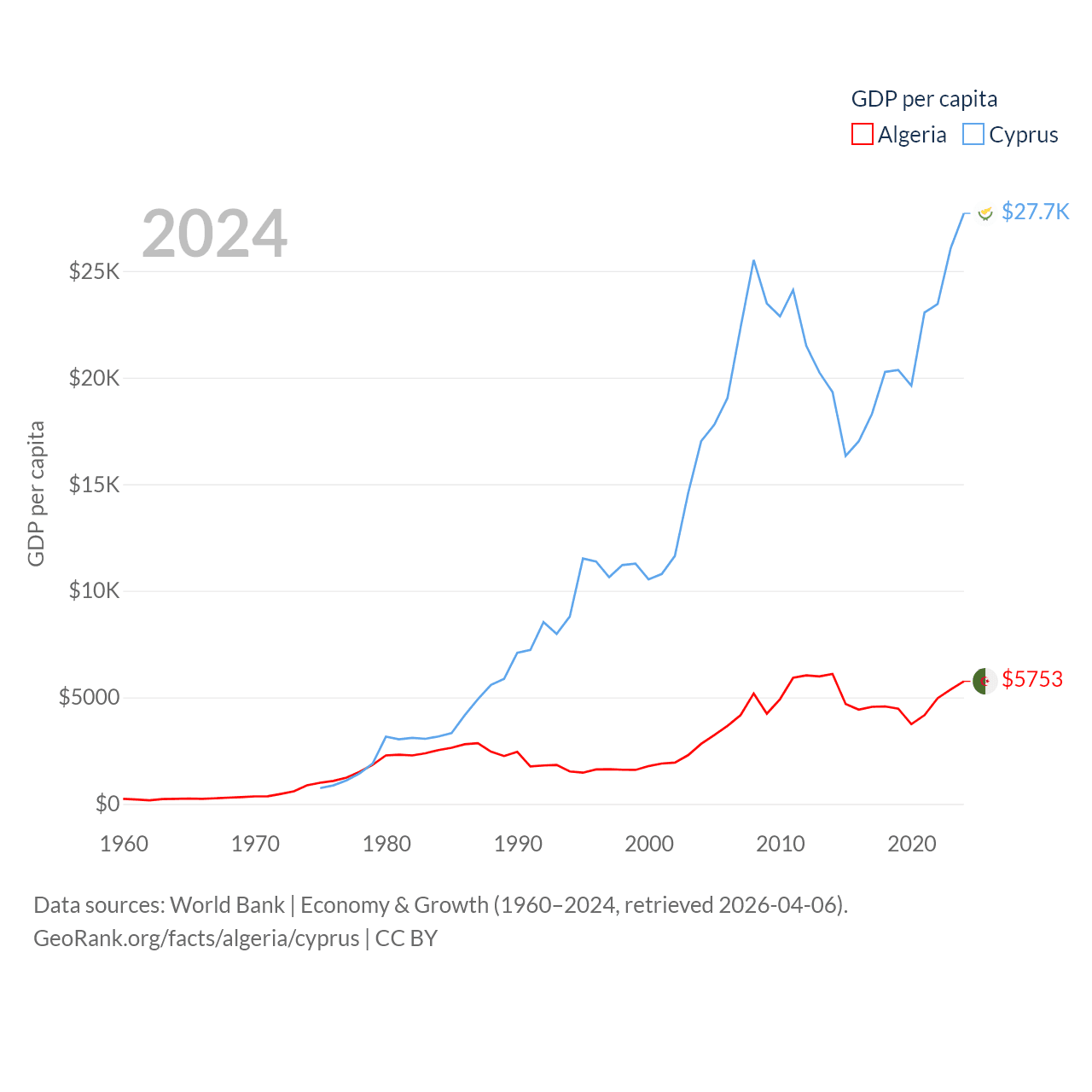 By GDP, Algeria ranks 51/197 ($269B) and Cyprus ranks 103/197 ($37.6B). By GDP per capita, Algeria ranks 114/197 ($5,753), while Cyprus ranks 45/197 ($27,707).