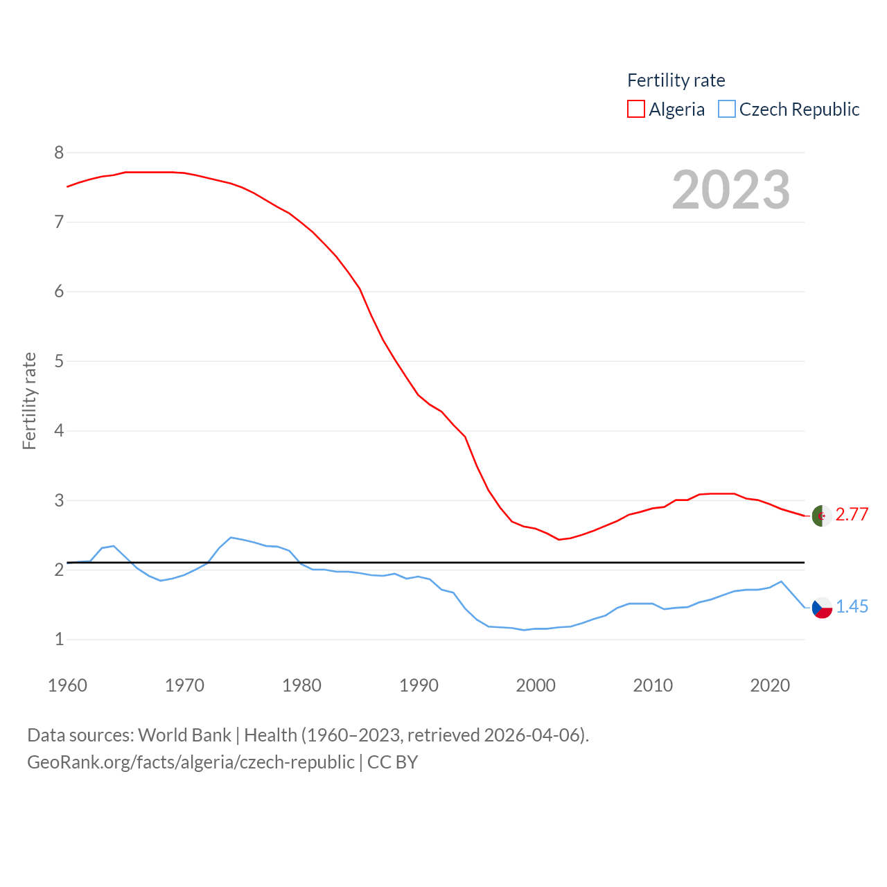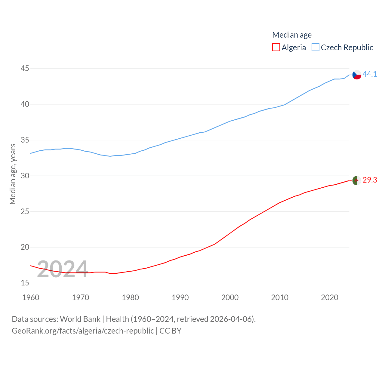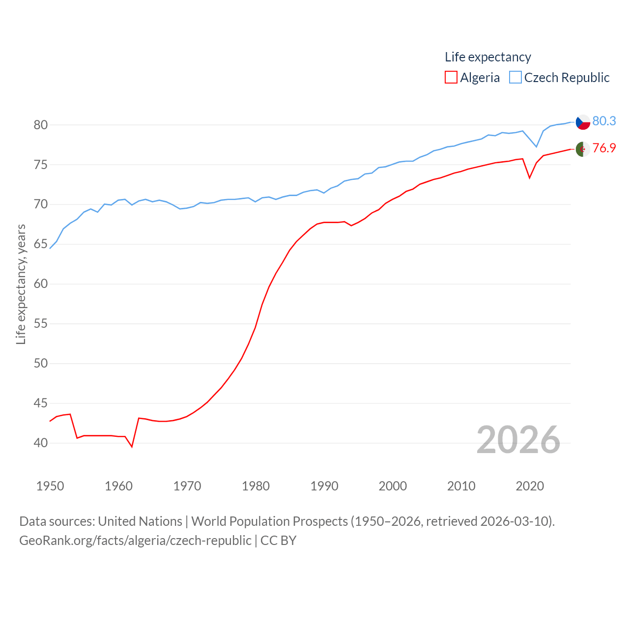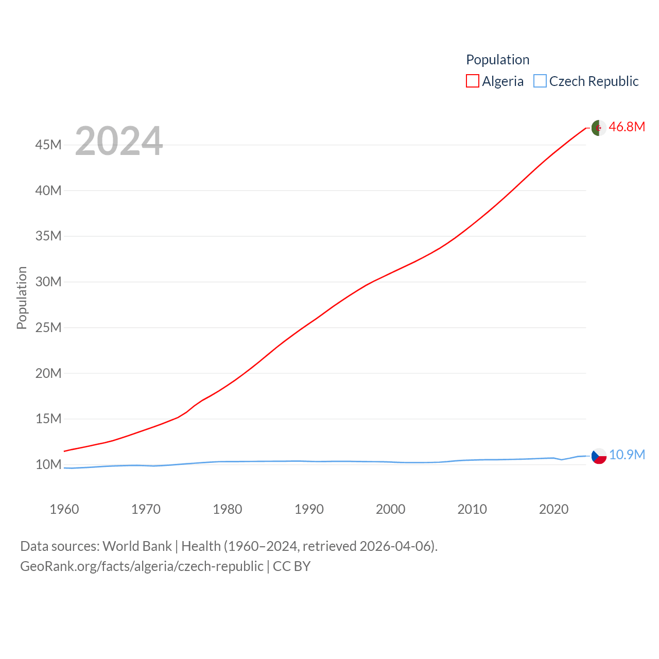Algeria has a population of 46.8M (ranked 33/197), compared with 10.9M in The Czech Republic (ranked 88/197). Algeria's land area is 919,595 sq mi versus 29,794 sq mi for The Czech Republic (ranked 10th vs. 114th).