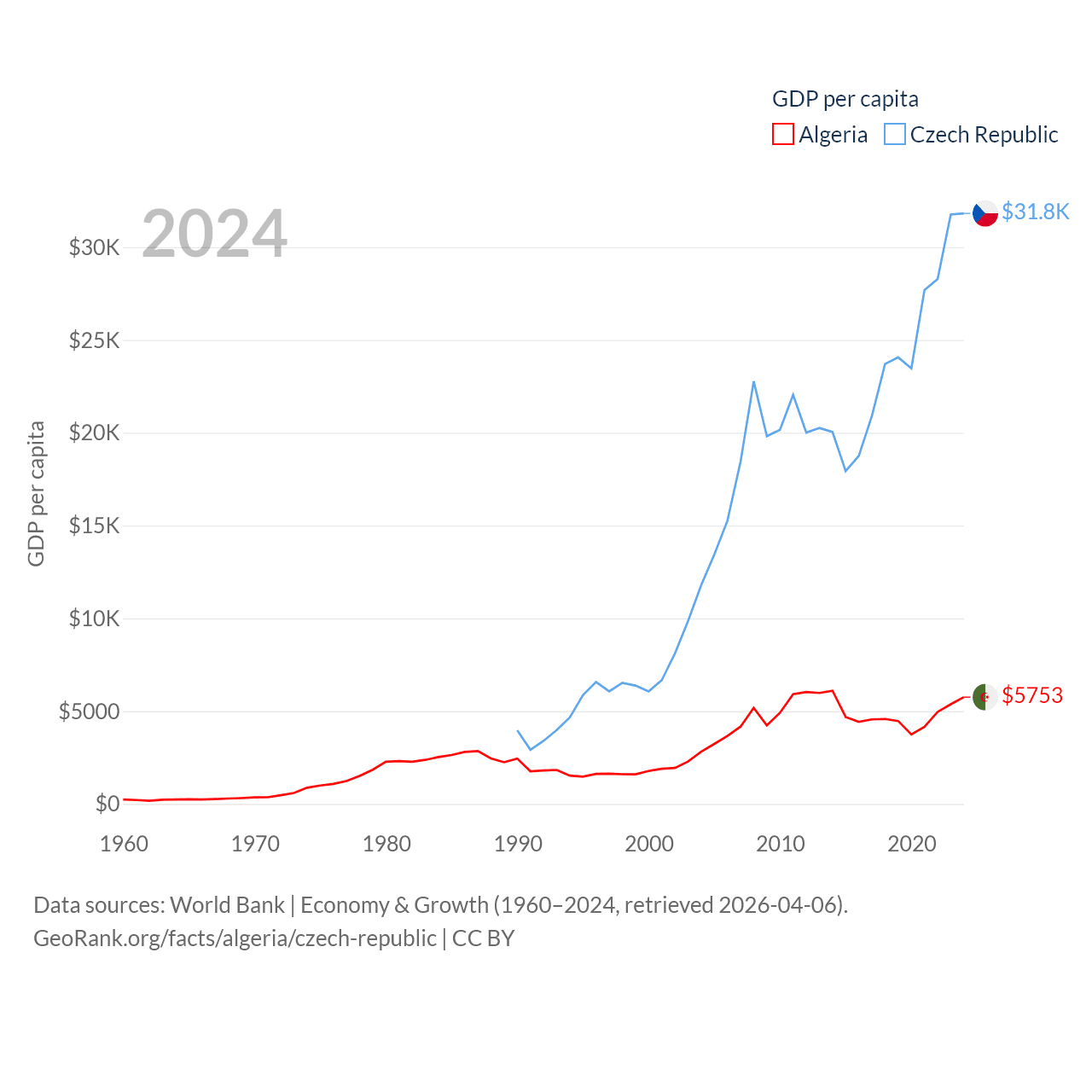 By GDP, Algeria ranks 51/197 ($269B) and The Czech Republic ranks 44/197 ($347B). By GDP per capita, Algeria ranks 114/197 ($5,753), while The Czech Republic ranks 39/197 ($31,823).