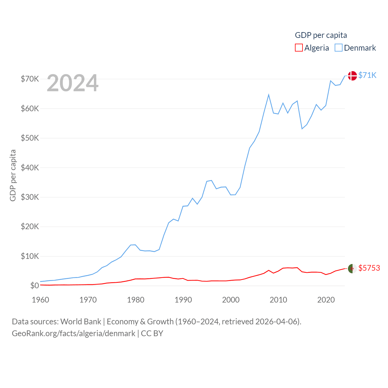 By GDP, Algeria ranks 51/197 ($269B) and Denmark ranks 37/197 ($425B). By GDP per capita, Algeria ranks 114/197 ($5,753), while Denmark ranks 12/197 ($71,026).