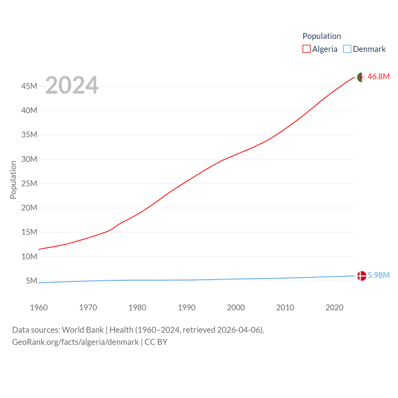Algeria has a population of 46.8M (ranked 33/197), compared with 5.98M in Denmark (ranked 114/197). Algeria's land area is 919,595 sq mi versus 15,444 sq mi for Denmark (ranked 10th vs. 130th).