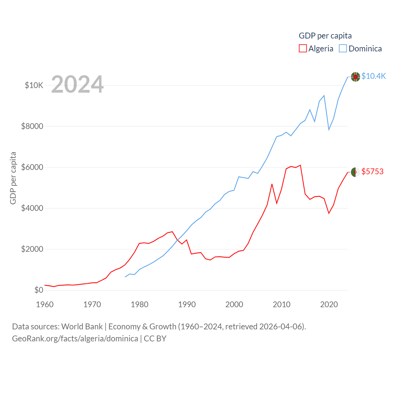 By GDP, Algeria ranks 51/197 ($269B) and Dominica ranks 190/197 ($689M). By GDP per capita, Algeria ranks 114/197 ($5,753), while Dominica ranks 84/197 ($10,405).