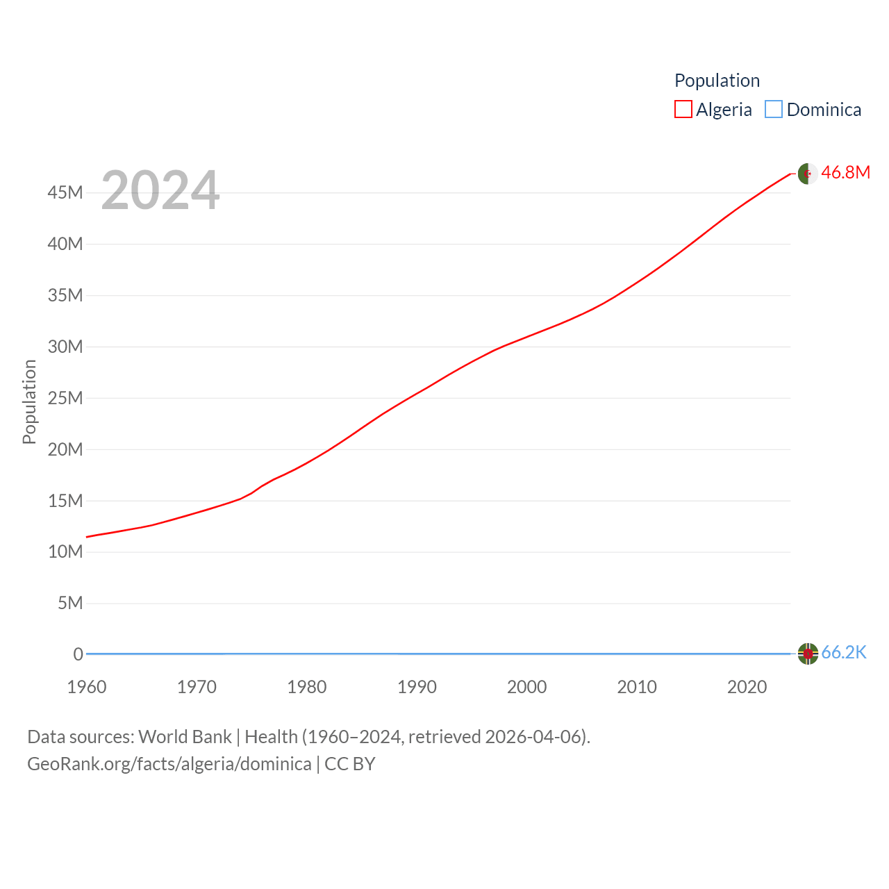 Algeria has a population of 46.8M (ranked 33/197), compared with 66.2K in Dominica (ranked 188/197). Algeria's land area is 919,595 sq mi versus 289.6 sq mi for Dominica (ranked 10th vs. 175th).