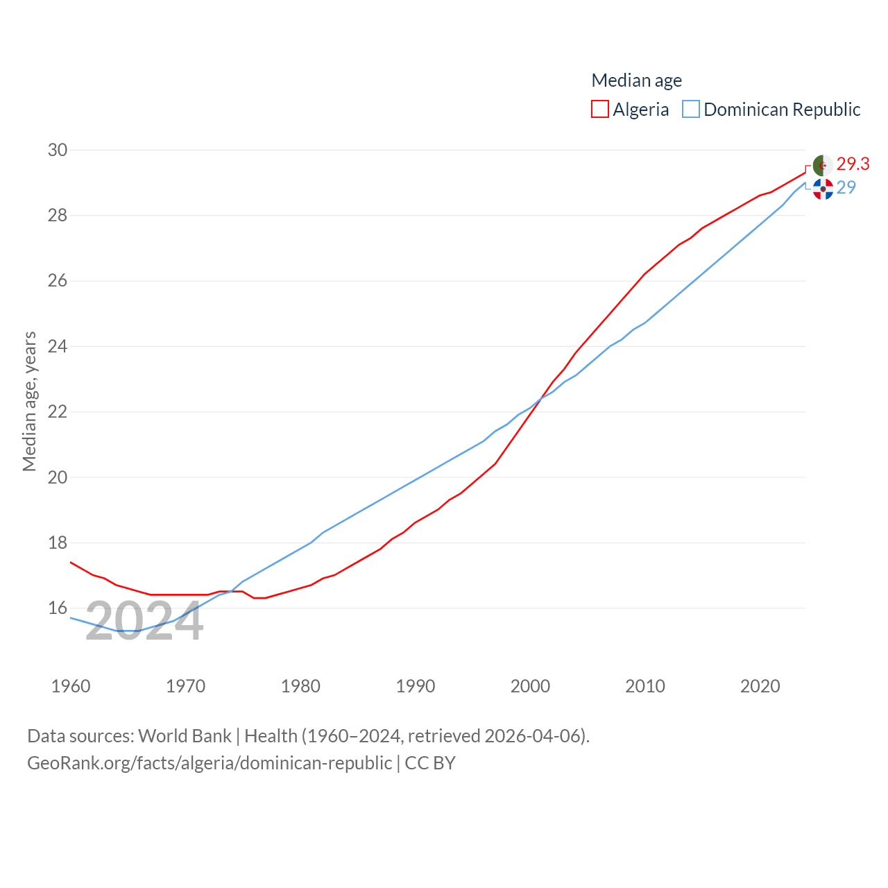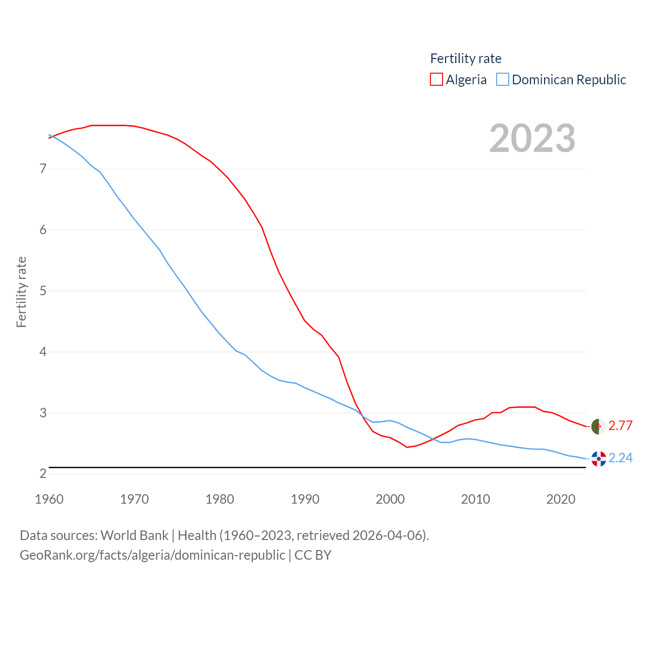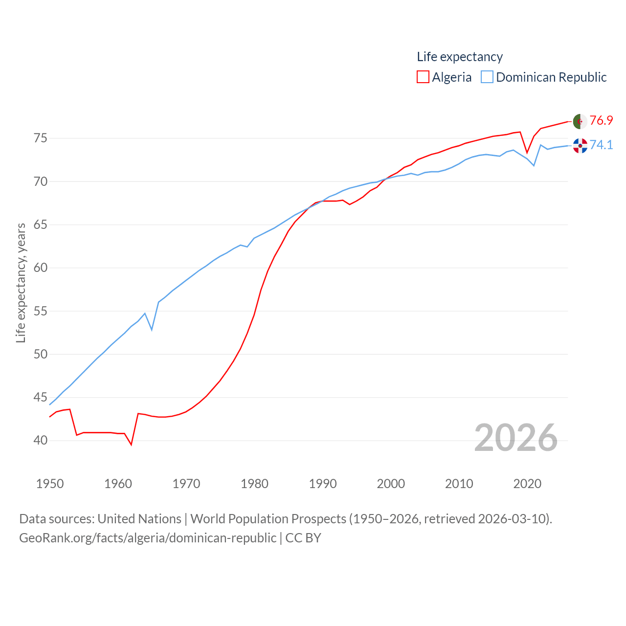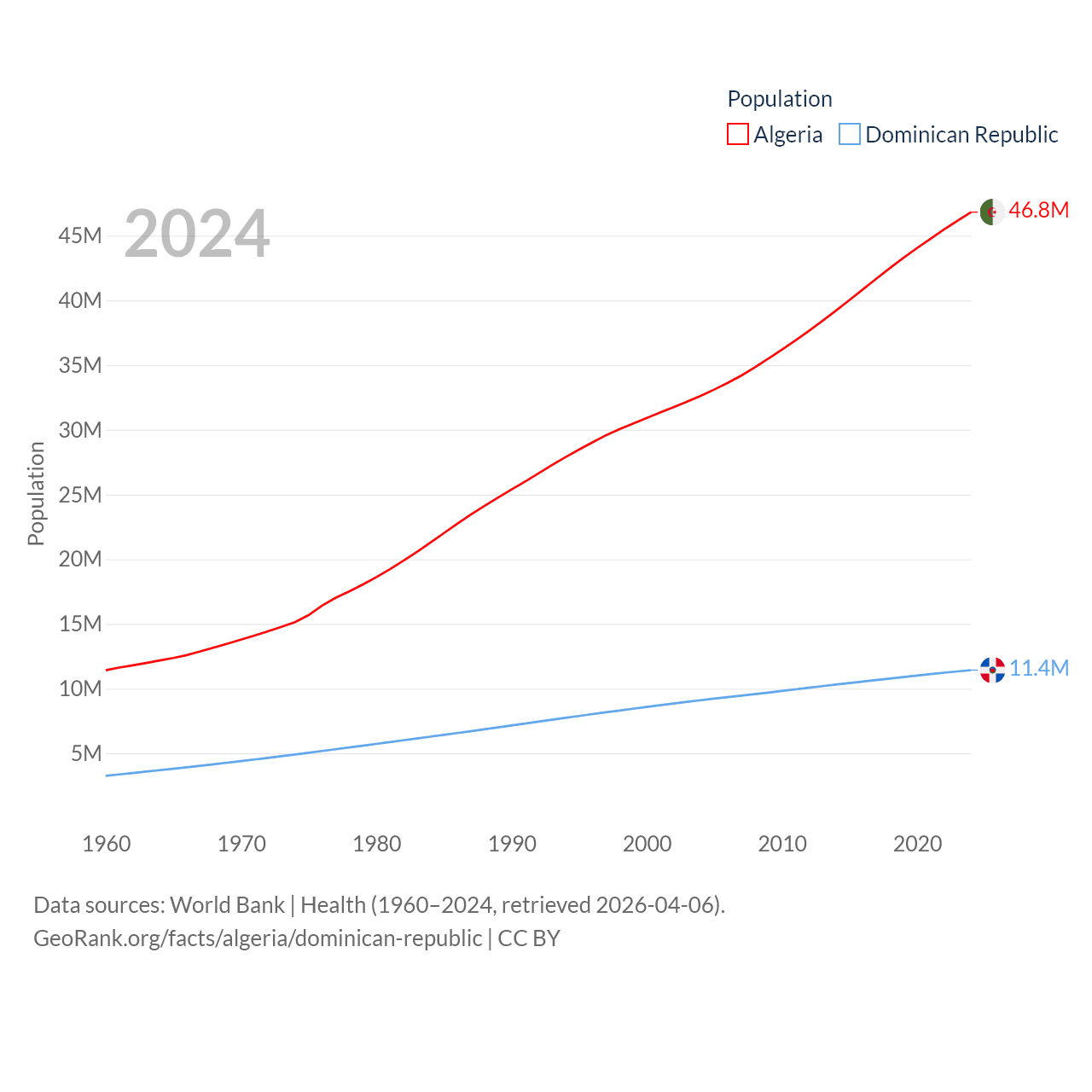 Algeria has a population of 46.8M (ranked 33/197), compared with 11.4M in The Dominican Republic (ranked 85/197). Algeria's land area is 919,595 sq mi versus 18,609 sq mi for The Dominican Republic (ranked 10th vs. 127th).