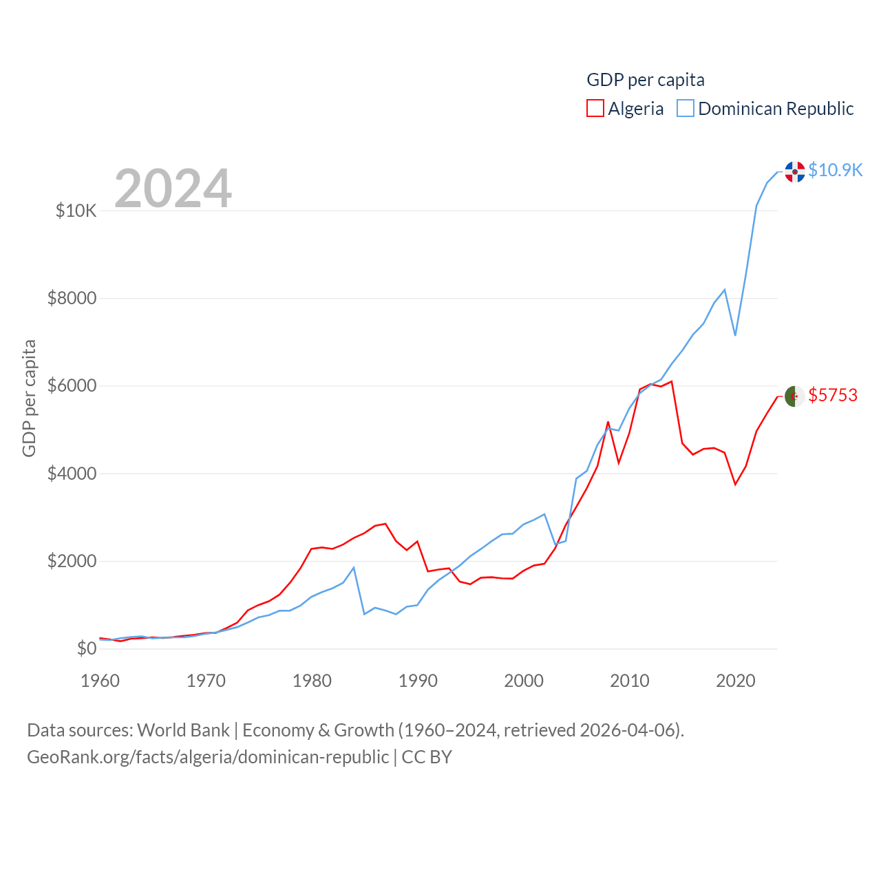 By GDP, Algeria ranks 51/197 ($269B) and The Dominican Republic ranks 63/197 ($124B). By GDP per capita, Algeria ranks 114/197 ($5,753), while The Dominican Republic ranks 83/197 ($10,876).