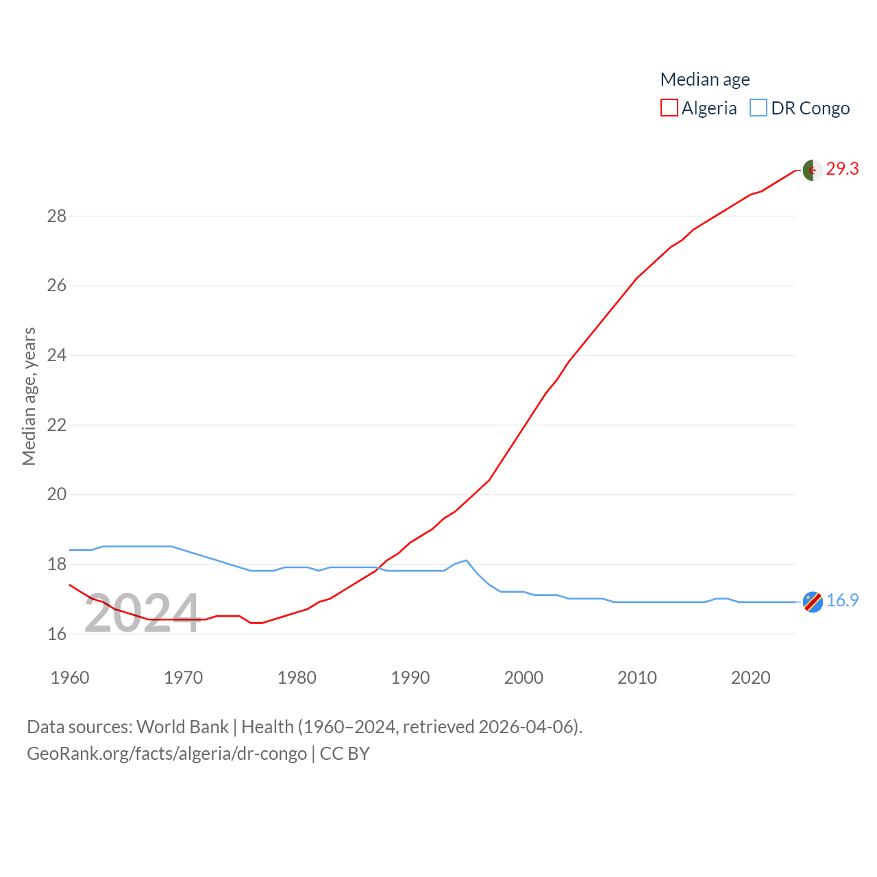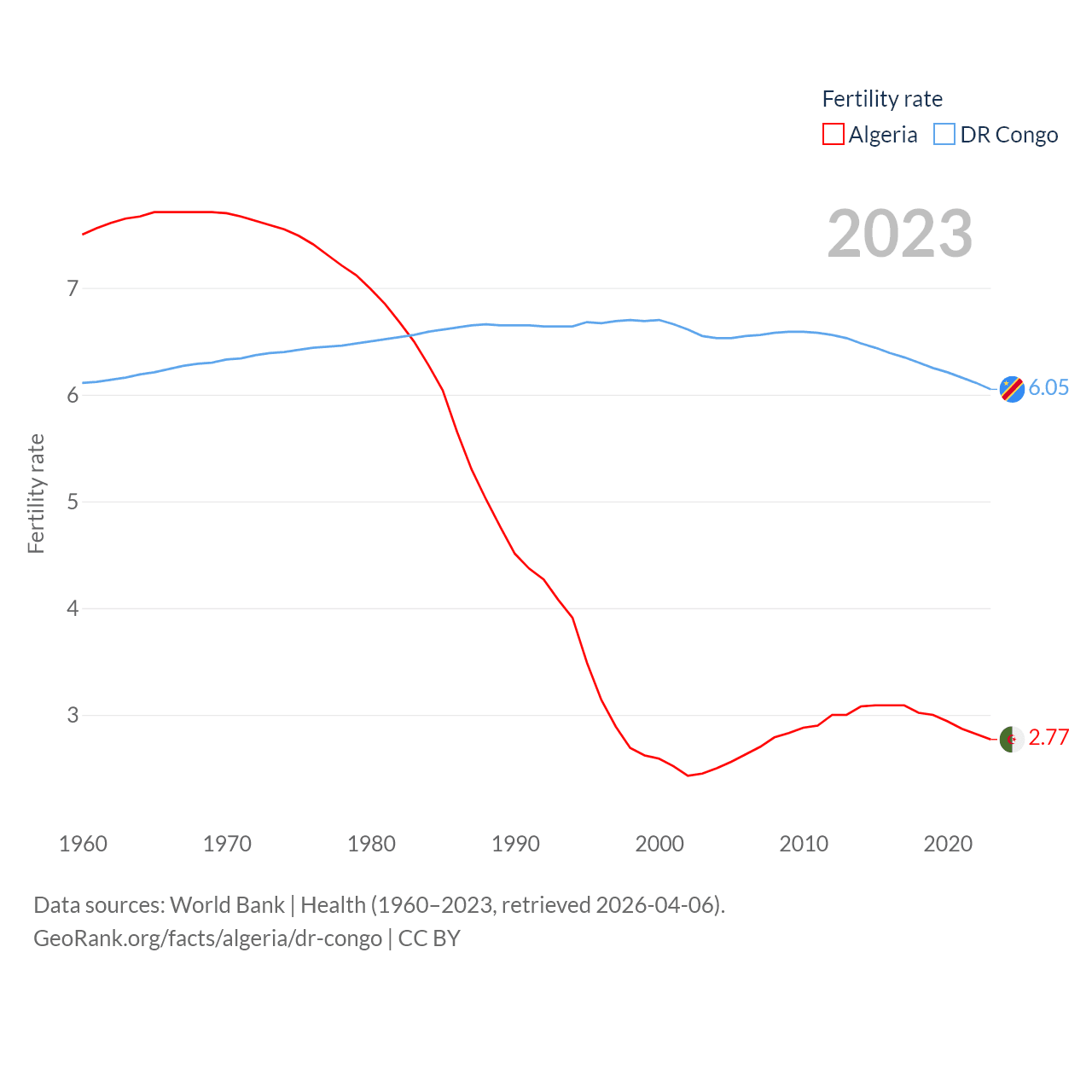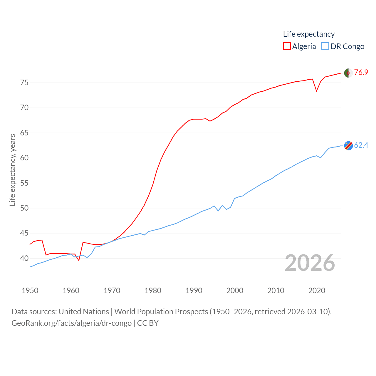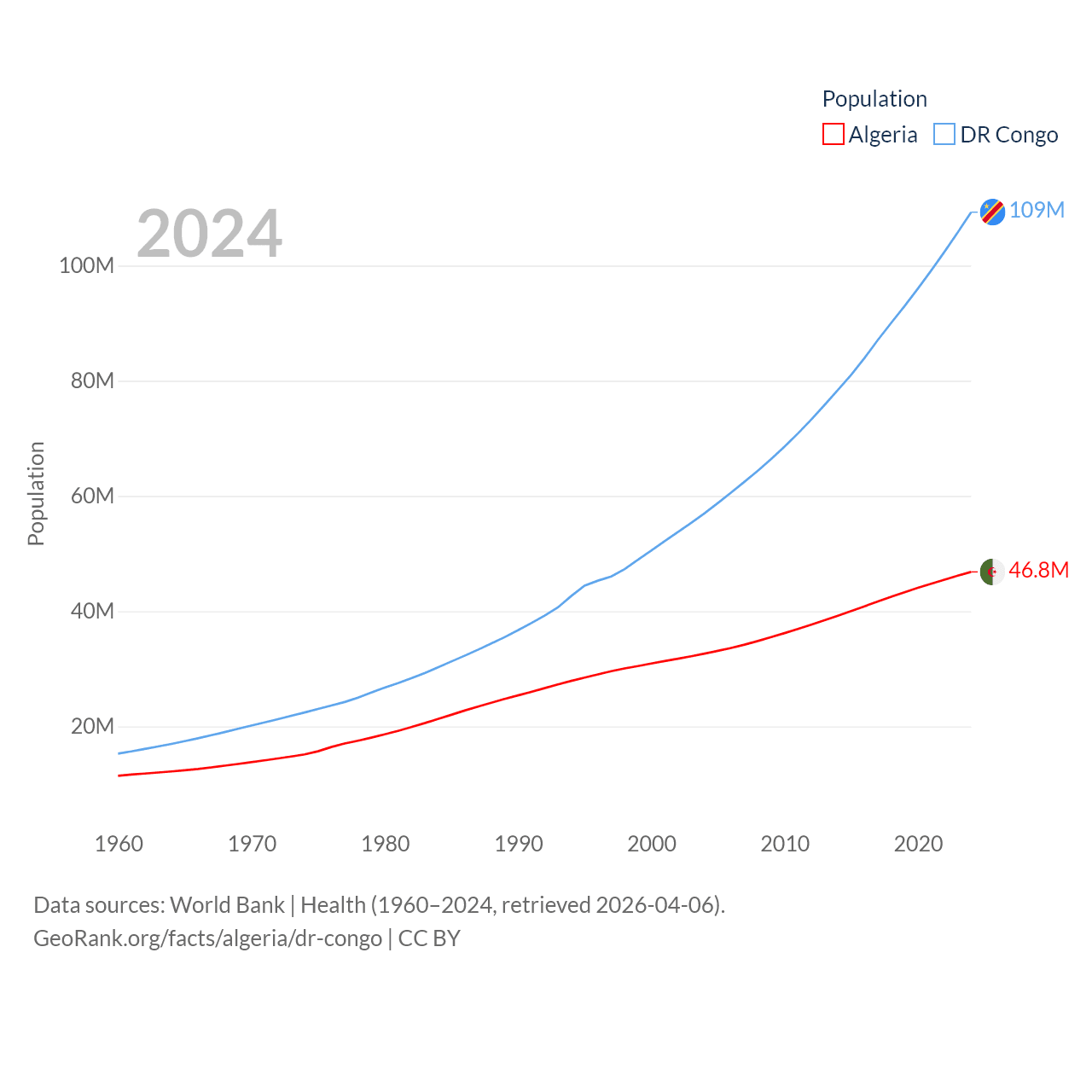 Algeria has a population of 46.8M (ranked 33/197), compared with 109M in The DR Congo (ranked 15/197). Algeria's land area is 919,595 sq mi versus 875,313 sq mi for The DR Congo (ranked 10th vs. 11th).