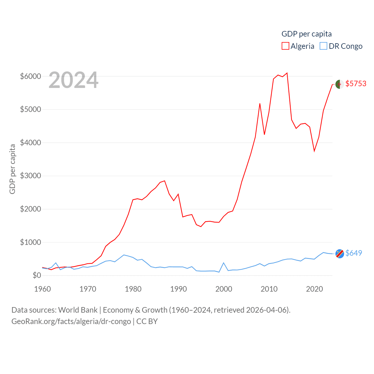 By GDP, Algeria ranks 51/197 ($269B) and The DR Congo ranks 87/197 ($71B). By GDP per capita, Algeria ranks 114/197 ($5,753), while The DR Congo ranks 190/197 ($649).