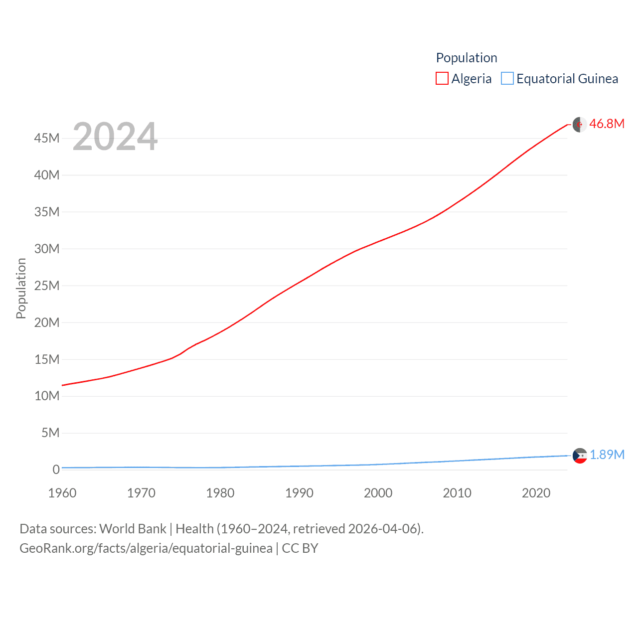 Algeria has a population of 46.8M (ranked 33/197), compared with 1.89M in Equatorial Guinea (ranked 148/197). Algeria's land area is 919,595 sq mi versus 10,830 sq mi for Equatorial Guinea (ranked 10th vs. 140th).