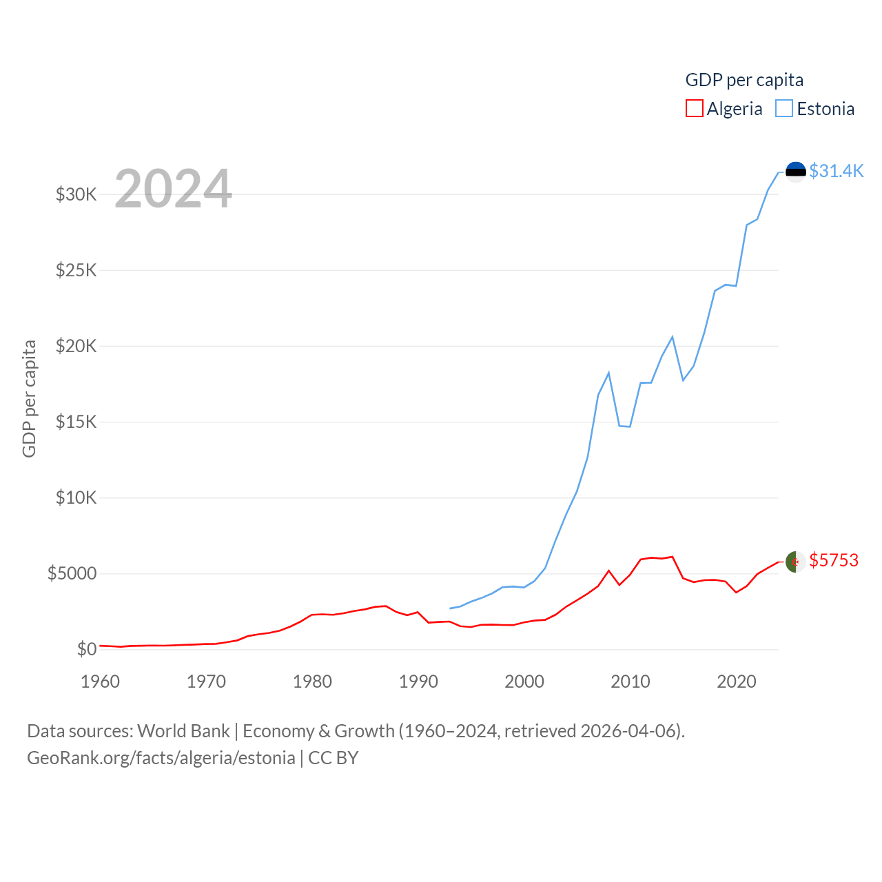 By GDP, Algeria ranks 51/197 ($269B) and Estonia ranks 100/197 ($43.1B). By GDP per capita, Algeria ranks 114/197 ($5,753), while Estonia ranks 40/197 ($31,428).