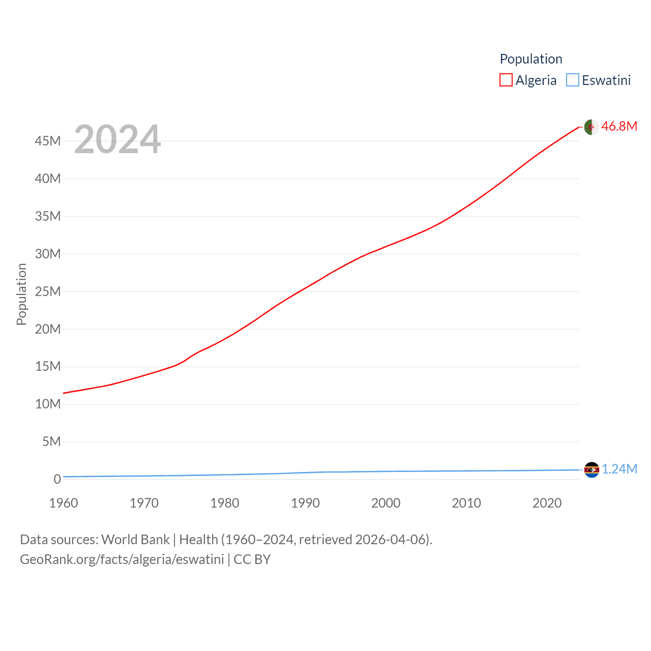 Algeria has a population of 46.8M (ranked 33/197), compared with 1.24M in Eswatini (ranked 157/197). Algeria's land area is 919,595 sq mi versus 6,641 sq mi for Eswatini (ranked 10th vs. 154th).