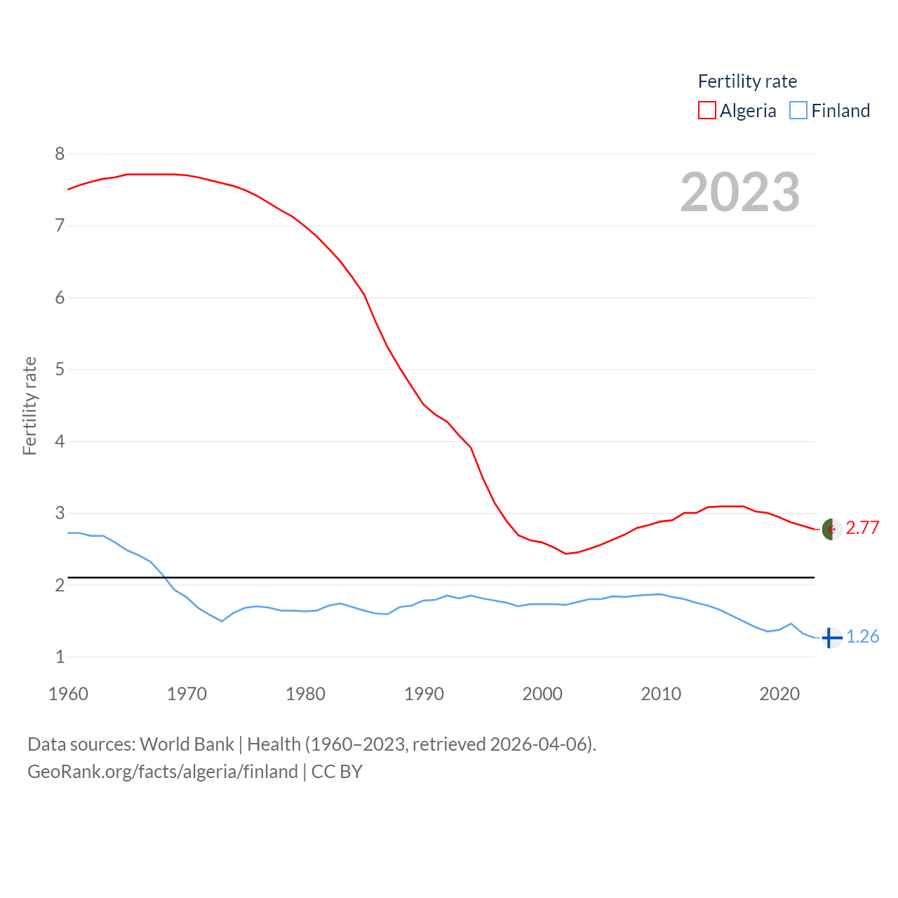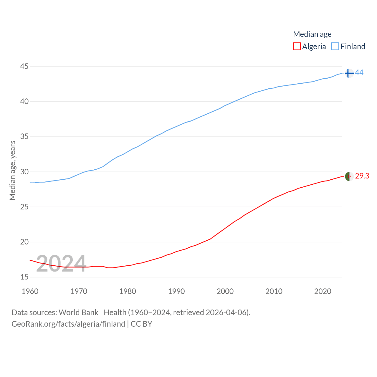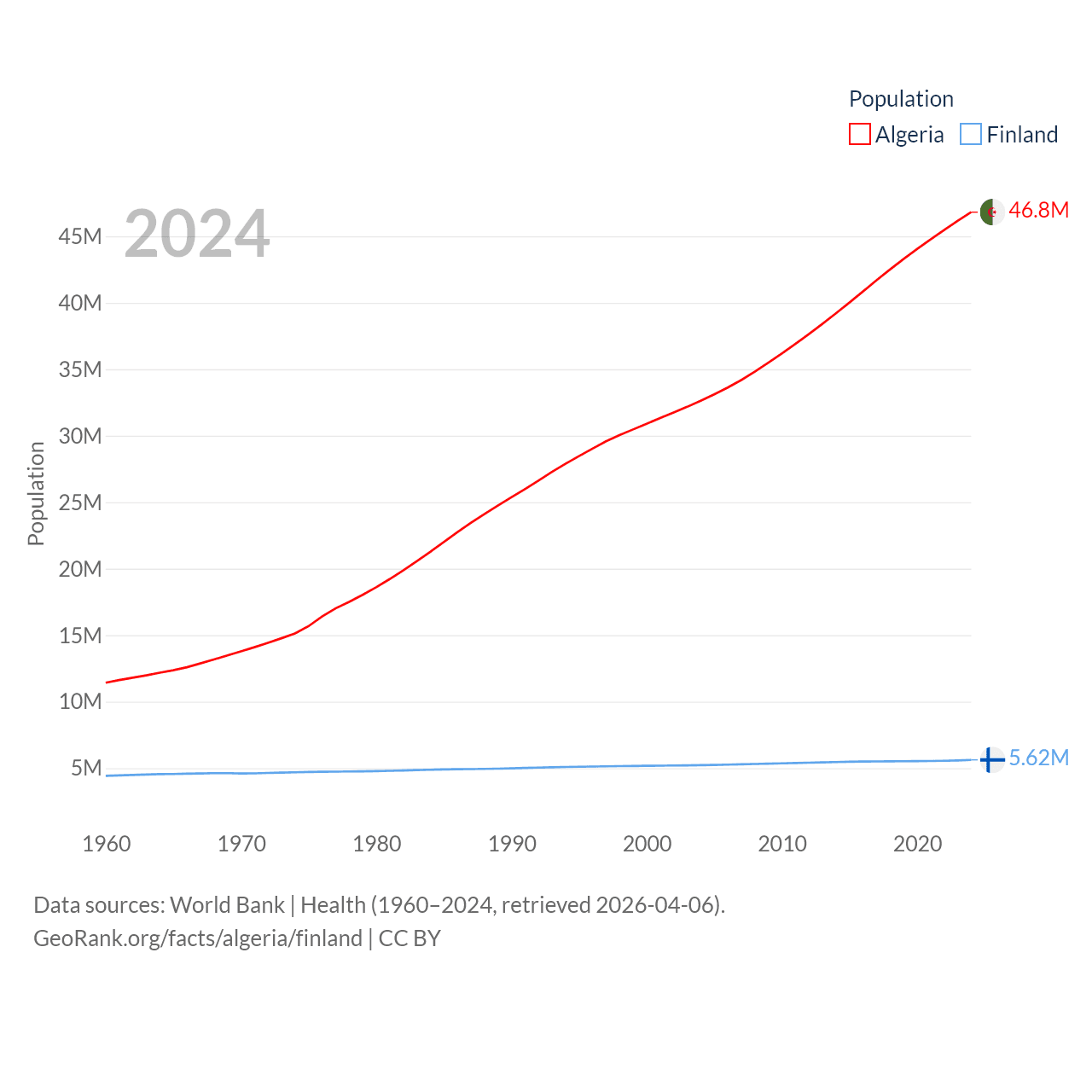 Algeria has a population of 46.8M (ranked 33/197), compared with 5.62M in Finland (ranked 116/197). Algeria's land area is 919,595 sq mi versus 117,360 sq mi for Finland (ranked 10th vs. 70th).