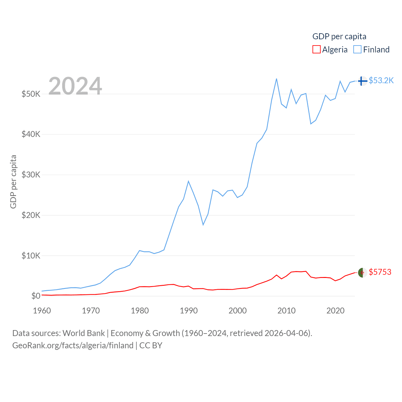 By GDP, Algeria ranks 51/197 ($269B) and Finland ranks 47/197 ($299B). By GDP per capita, Algeria ranks 114/197 ($5,753), while Finland ranks 23/197 ($53,150).