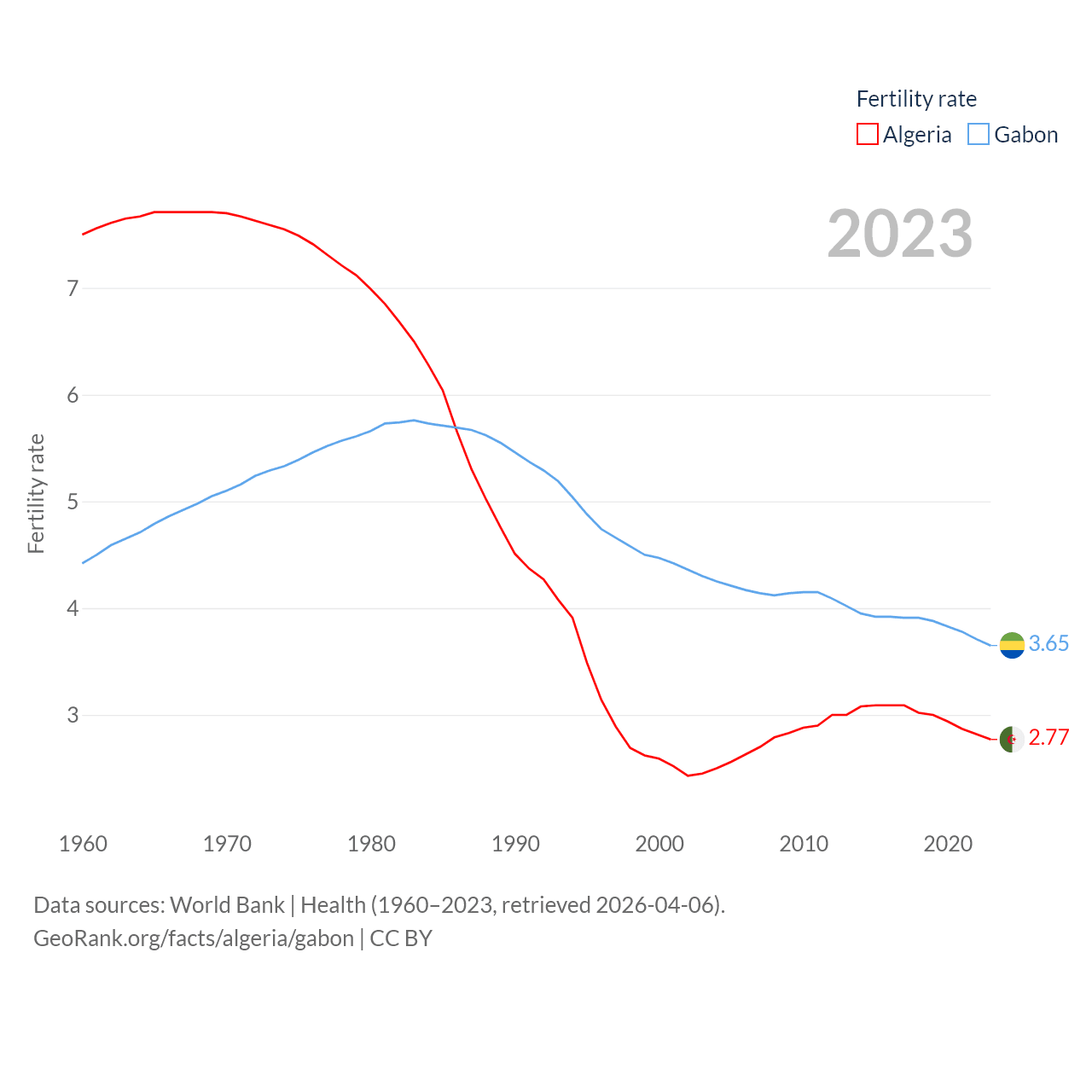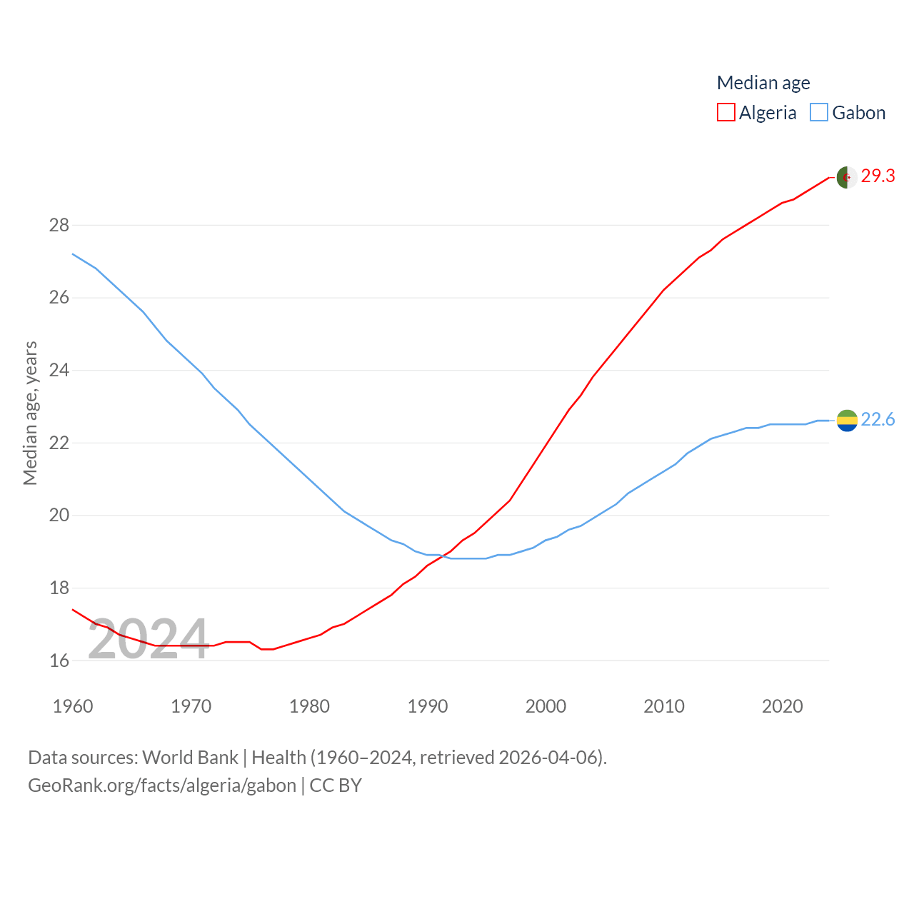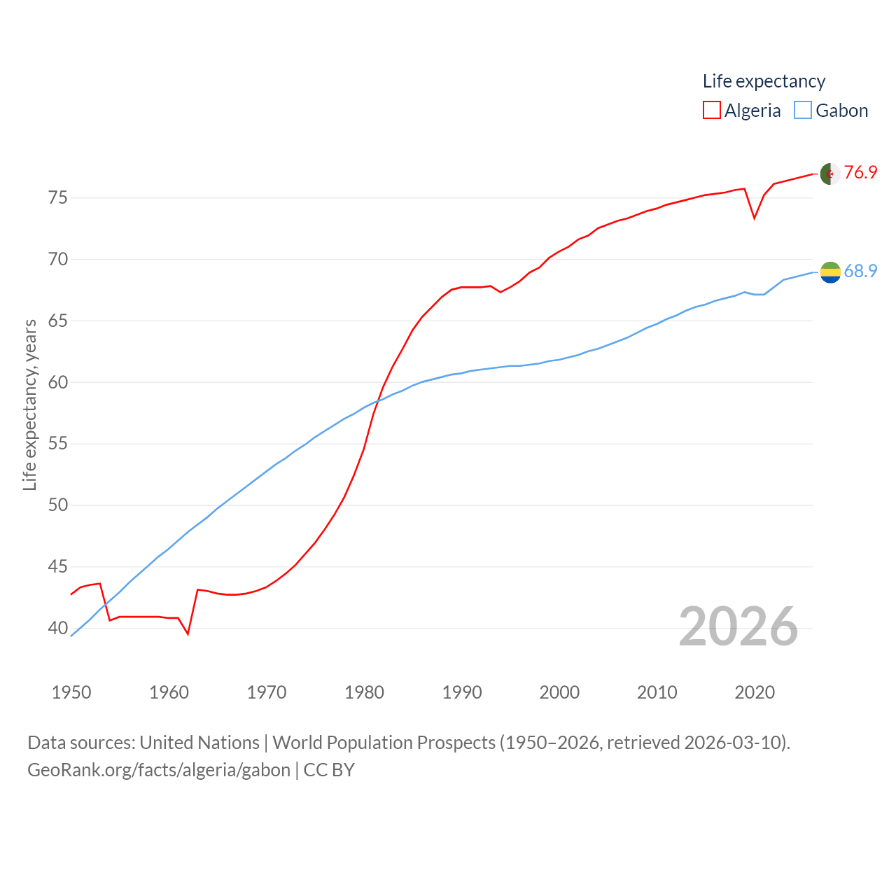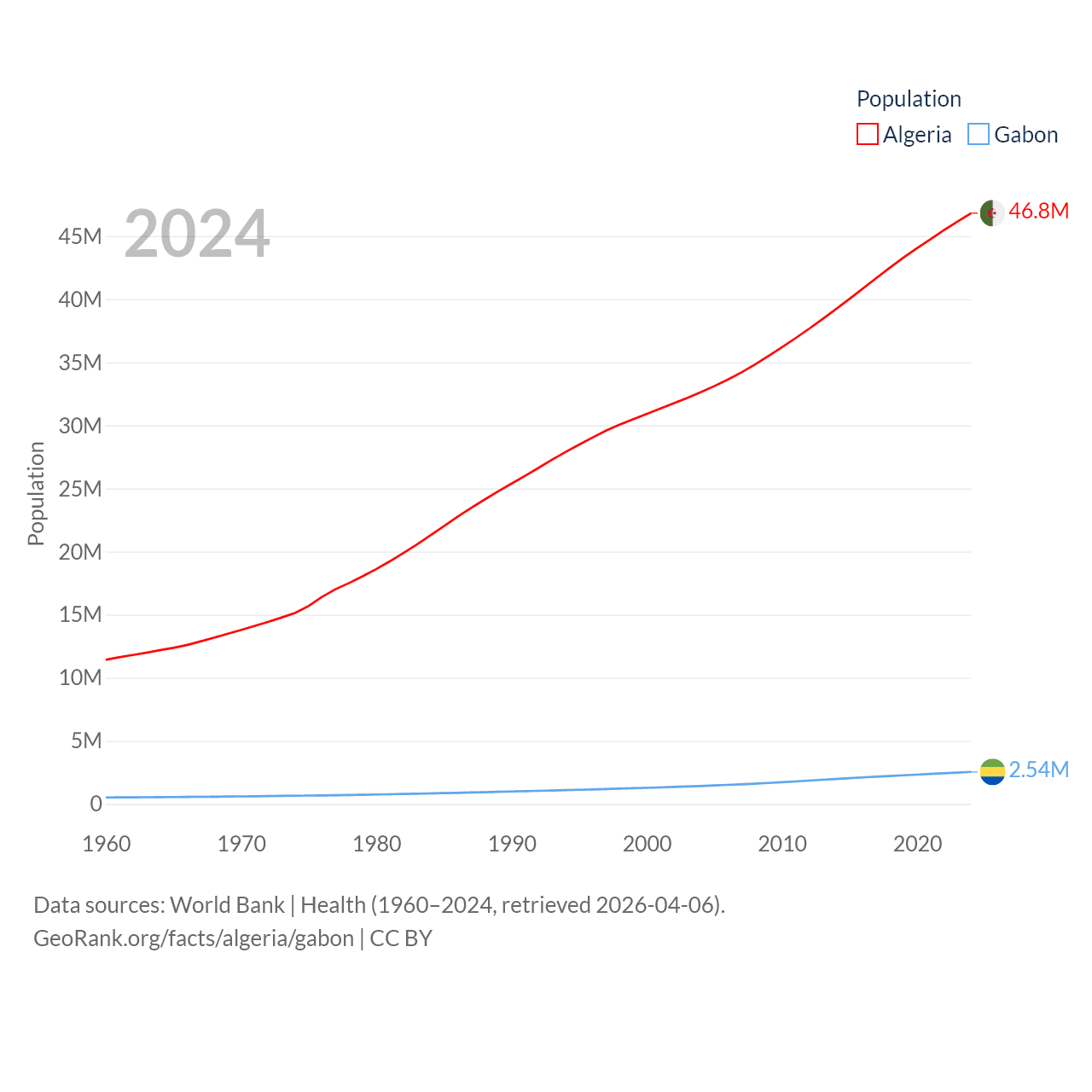 Algeria has a population of 46.8M (ranked 33/197), compared with 2.54M in Gabon (ranked 141/197). Algeria's land area is 919,595 sq mi versus 99,487 sq mi for Gabon (ranked 10th vs. 75th).
