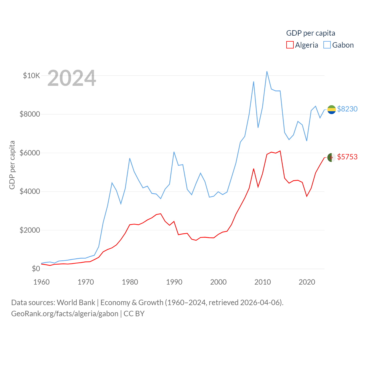 By GDP, Algeria ranks 51/197 ($269B) and Gabon ranks 127/197 ($20.9B). By GDP per capita, Algeria ranks 114/197 ($5,753), while Gabon ranks 93/197 ($8,230).
