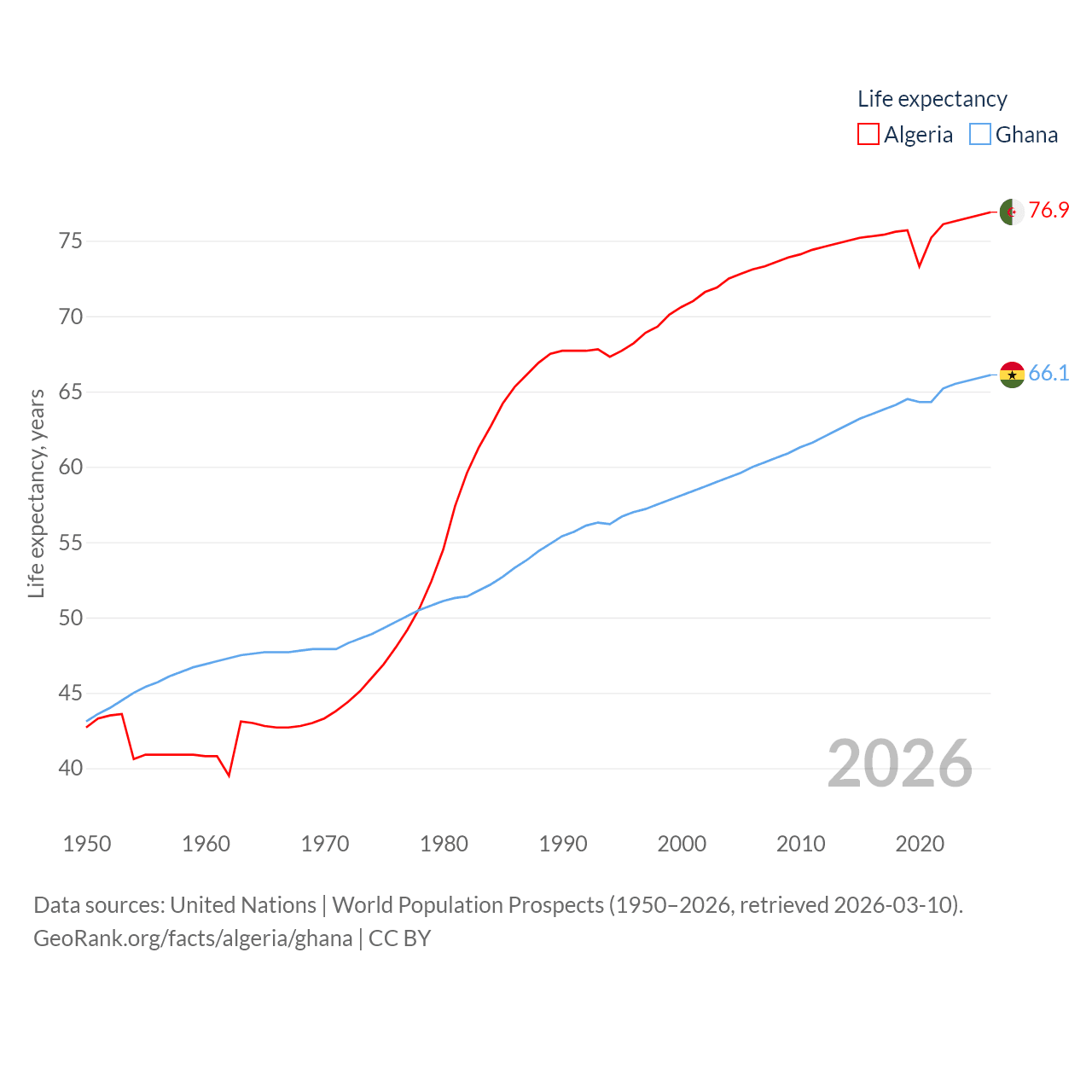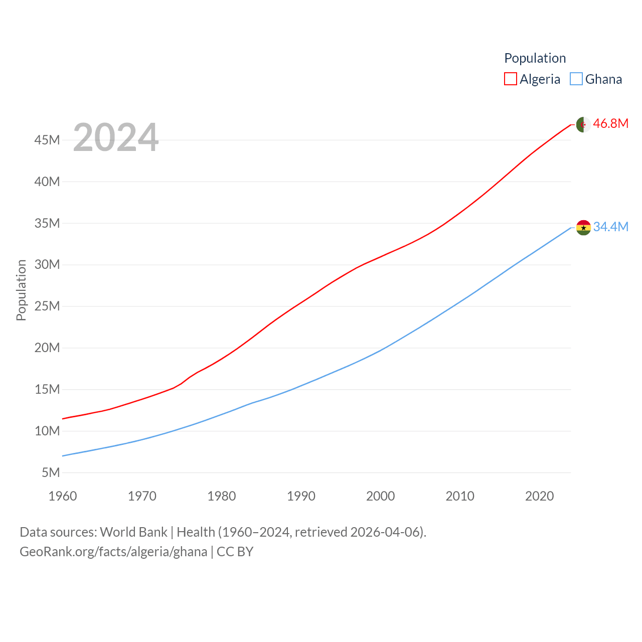 Algeria has a population of 46.8M (ranked 33/197), compared with 34.4M in Ghana (ranked 47/197). Algeria's land area is 919,595 sq mi versus 87,851 sq mi for Ghana (ranked 10th vs. 81st).