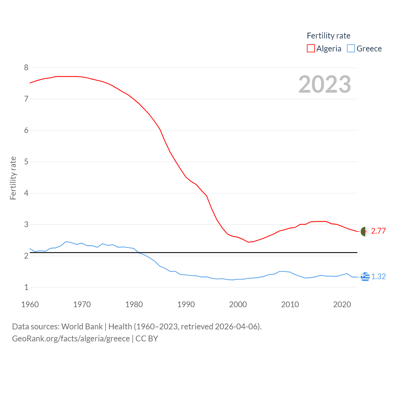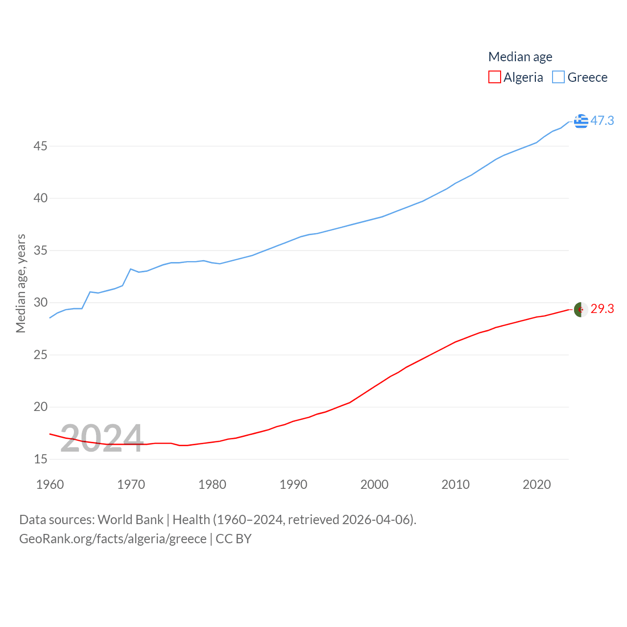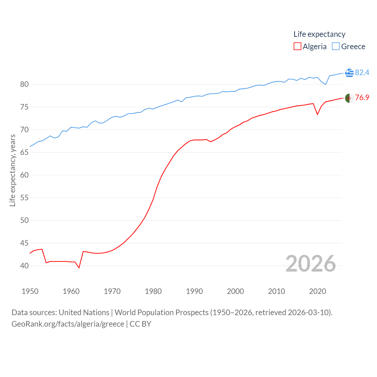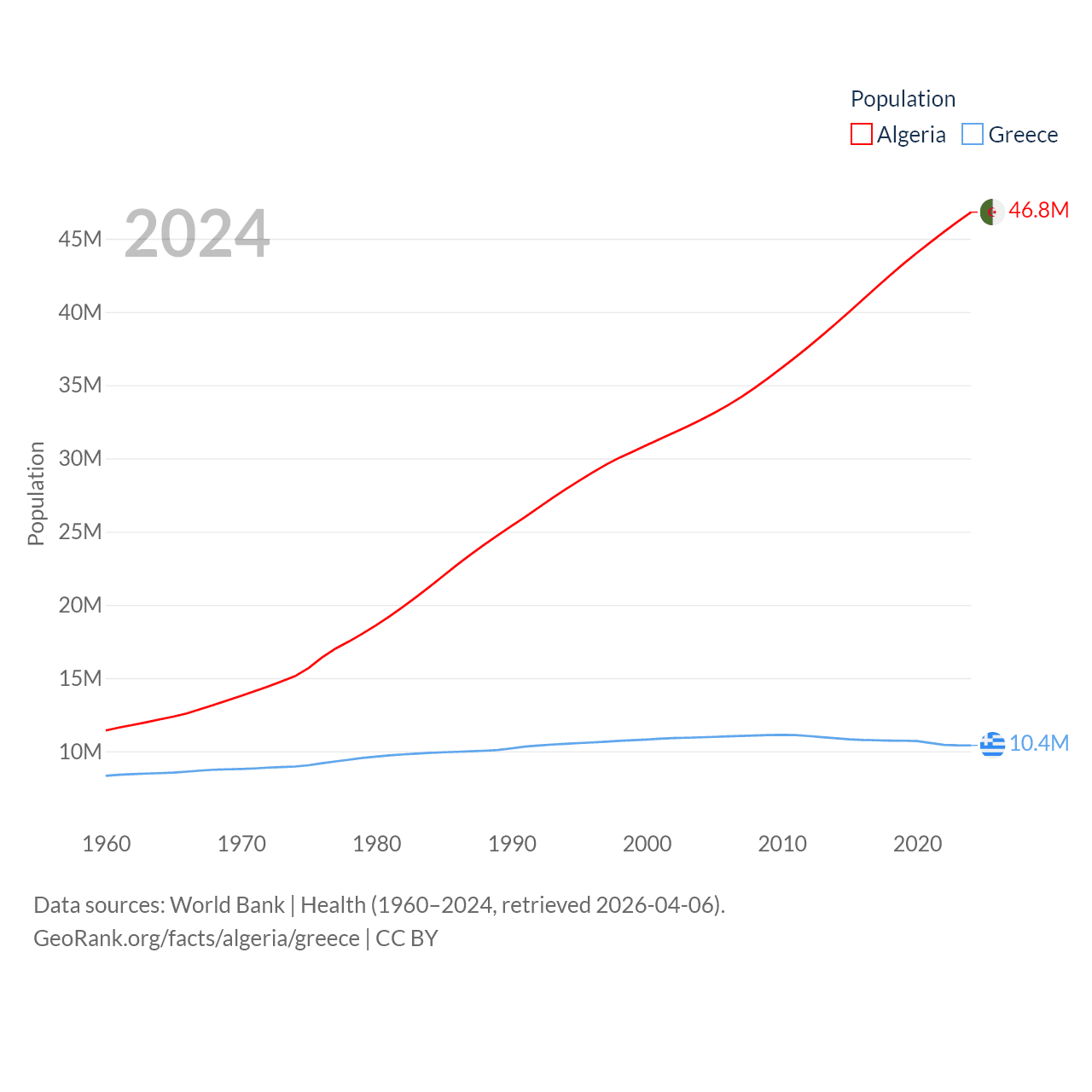 Algeria has a population of 46.8M (ranked 33/197), compared with 10.4M in Greece (ranked 94/197). Algeria's land area is 919,595 sq mi versus 49,769 sq mi for Greece (ranked 10th vs. 95th).