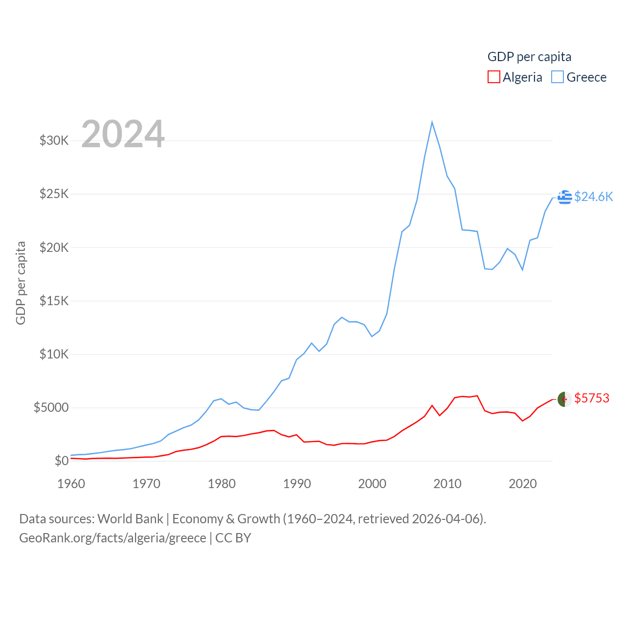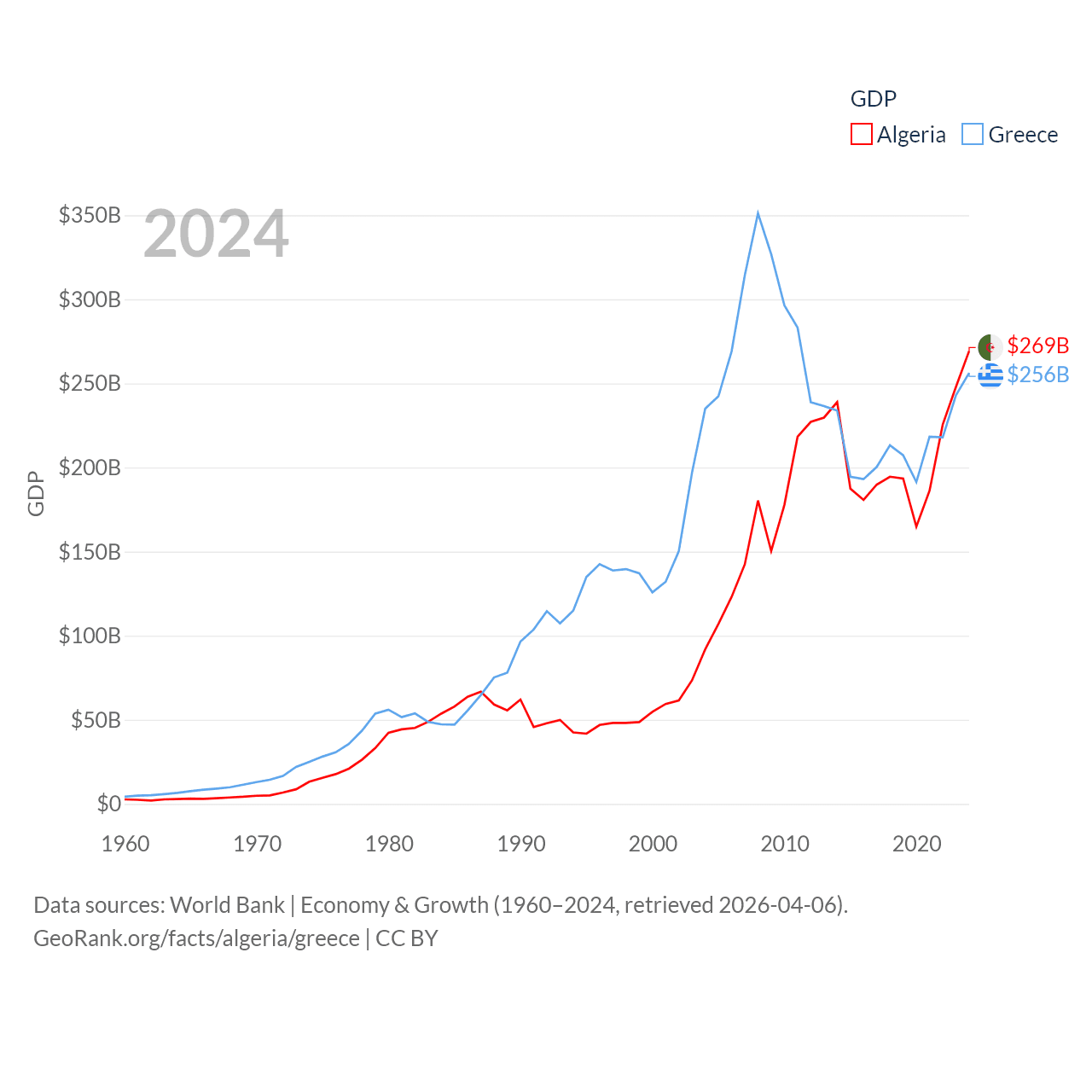 By GDP, Algeria ranks 51/197 ($269B) and Greece ranks 53/197 ($256B). By GDP per capita, Algeria ranks 114/197 ($5,753), while Greece ranks 49/197 ($24,626).