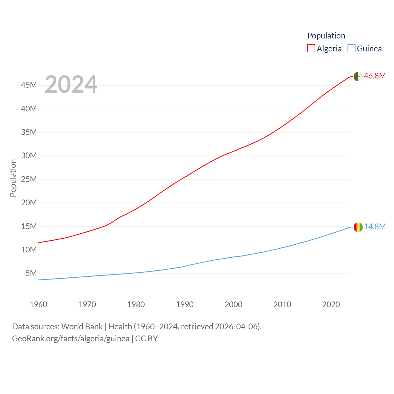 Algeria has a population of 46.8M (ranked 33/197), compared with 14.8M in Guinea (ranked 75/197). Algeria's land area is 919,595 sq mi versus 94,873 sq mi for Guinea (ranked 10th vs. 77th).